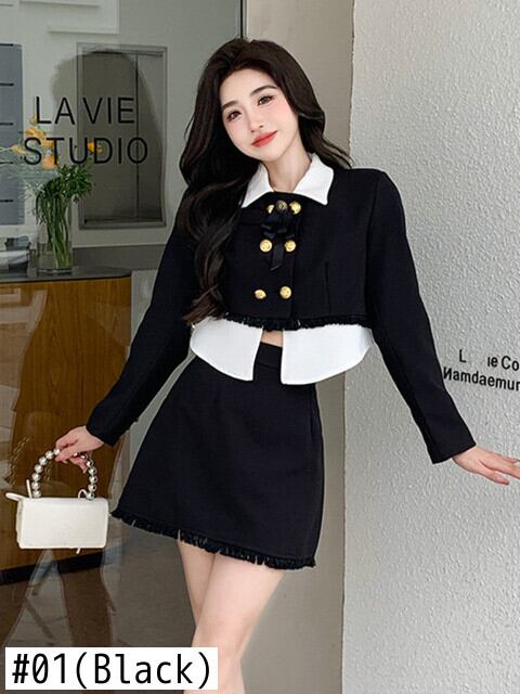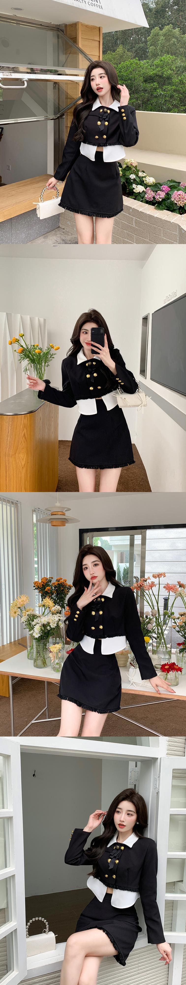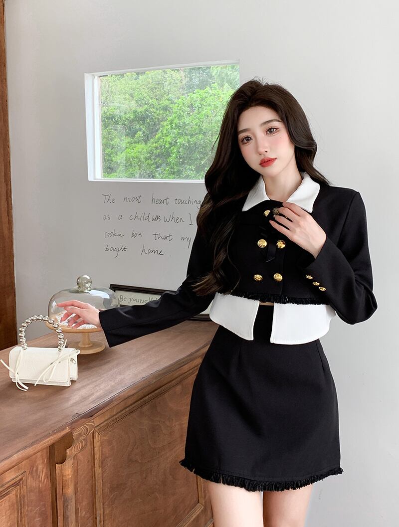 フレンチスモールフレグランスツーピースセットレディースダブルブレストショートジャケットコート+スカートセット2ピーススーツ