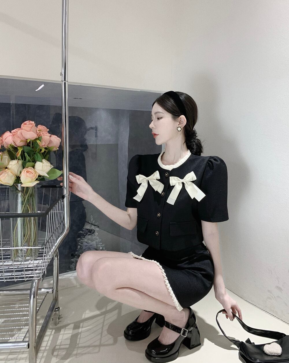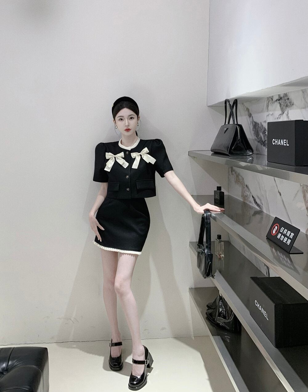 ストリートフレンチラグジュアリースモールフレグランス2点セットボウジャケットコート+ミニスカートスーツシックなツーピース衣装 リボン