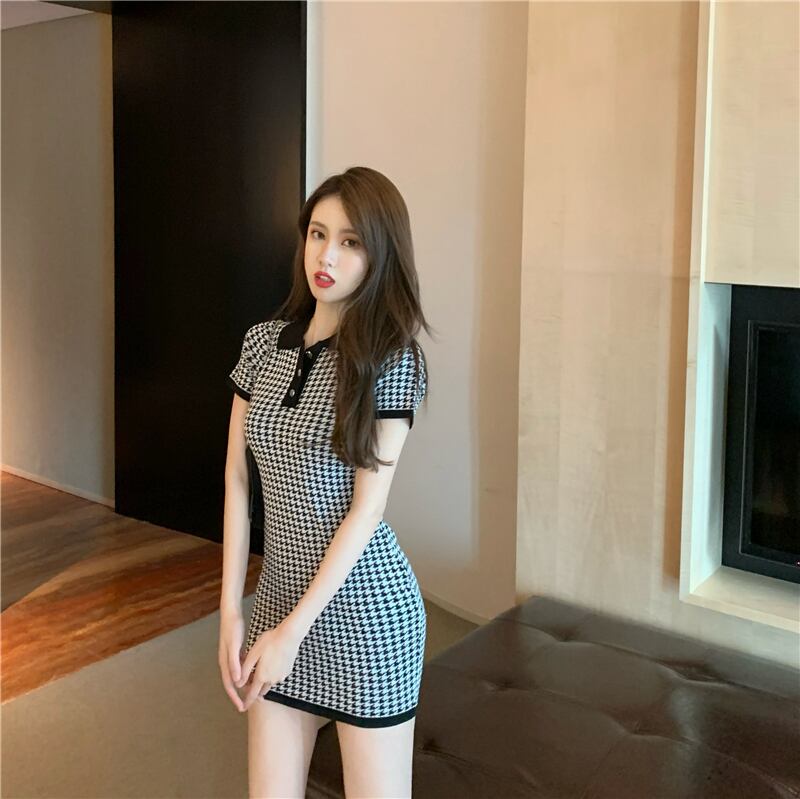 千鳥格子ニットミニサマードレス黒ボディコンセータードレスローブ Vestidos ブラック 夏物
