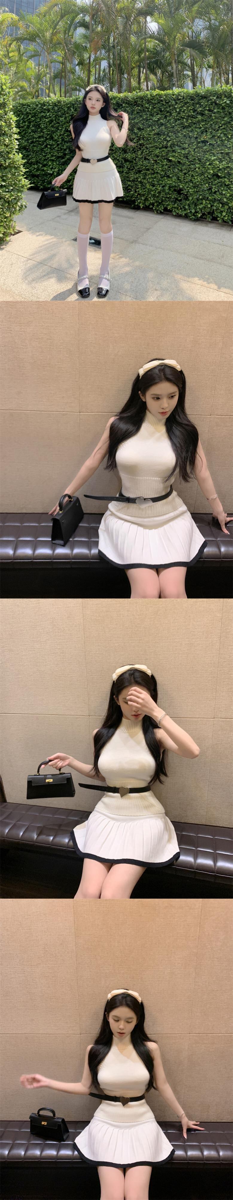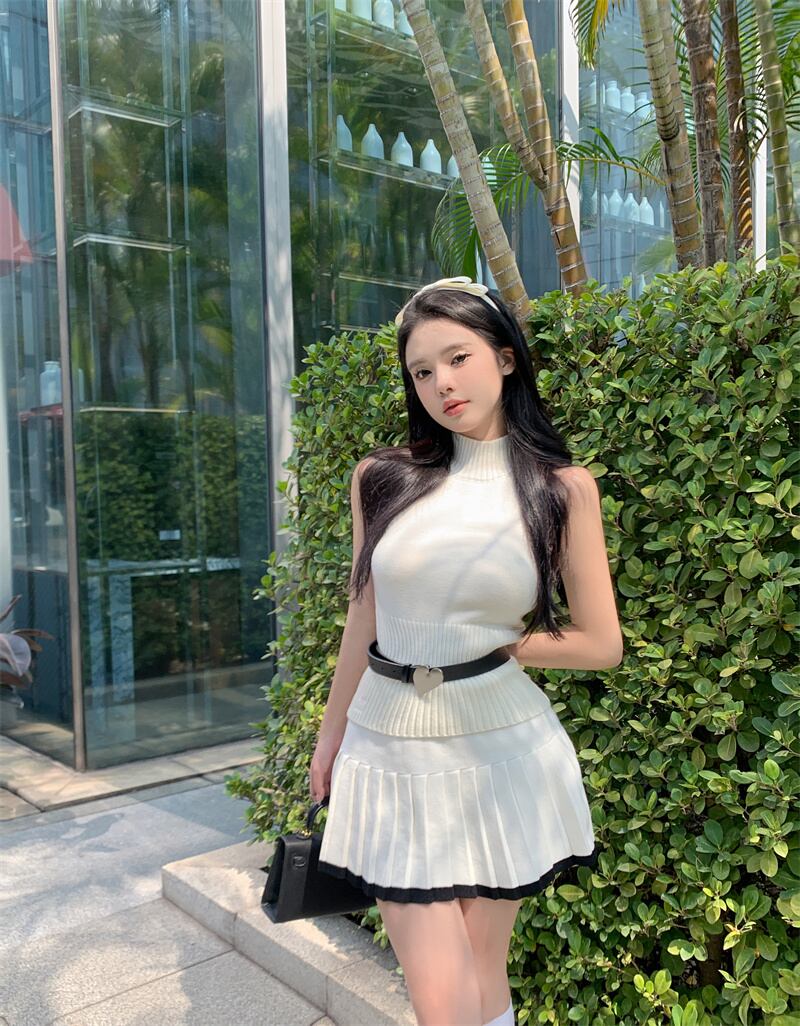 ガールズスウィートニットツーピースセットのセクシーなベスト + ウエストプリーツスカートセットセーター 2 ピーススーツ 大人ガーリー キュート カジュアル