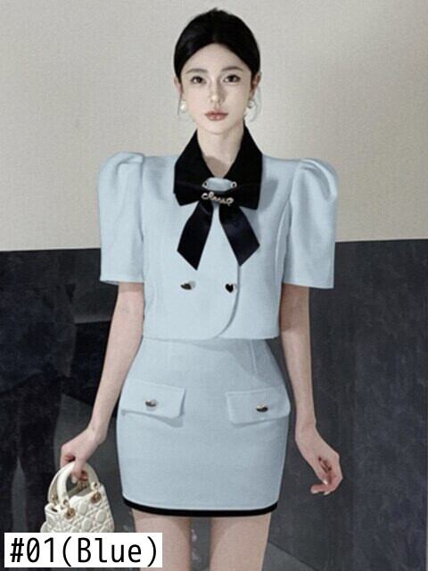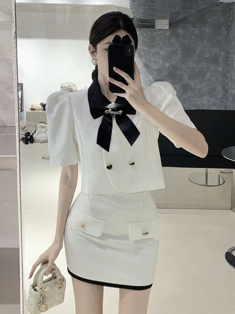 フレンチスモールフレグランスツーピースセットパフスリーブシャツクロップトップ + ミニスカートセットガールズスウィート 2 ピーススーツ 大人ガーリー キュート カジュアル