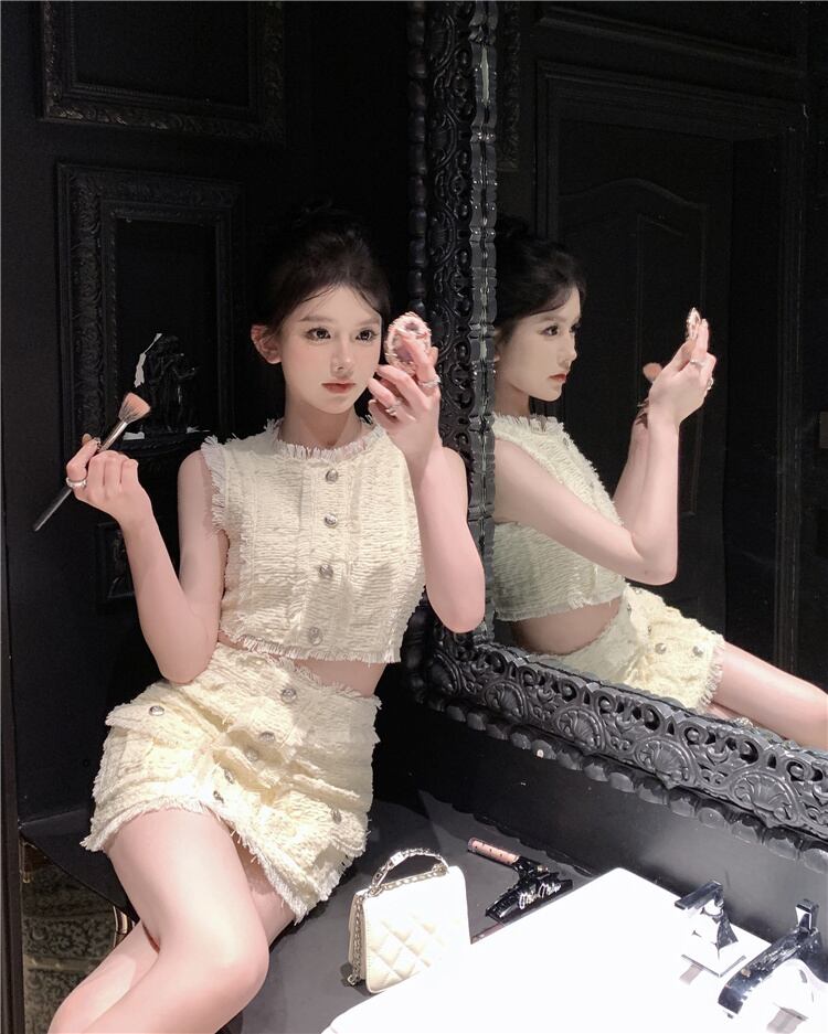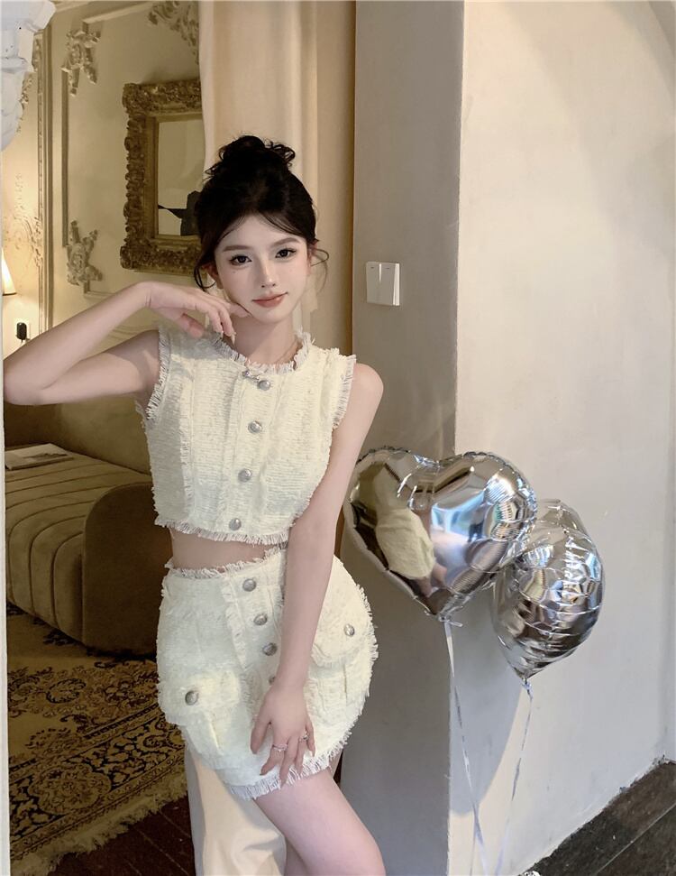 ストリートスモールフレグランスツイード 2 点セットクロップトップ + スカートセットフランスの高級夏ツーピーススーツ サマー 夏物