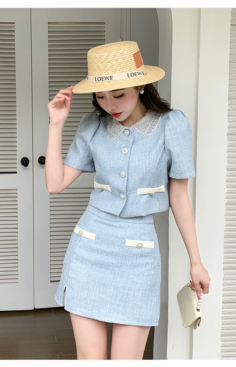 フレンチスモールフレグランスツーピースセット半袖トップ + スカートセット夏甘い 2 ピーススーツ ショート ハーフスリーブ 大人ガーリー スウィート キュート カジュアル サマー 夏物