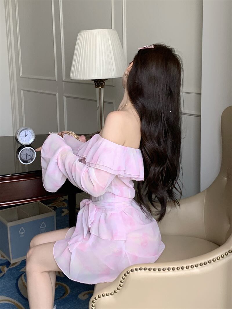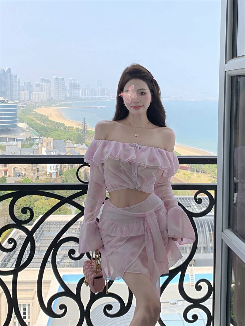 HotSweet ガールズプリントツーピースセットオフショルダーショートシャツクロップトップ & スカートセット夏休みビーチ 2 ピーススーツ 大人ガーリー スウィート キュート カジュアル サマー 夏物