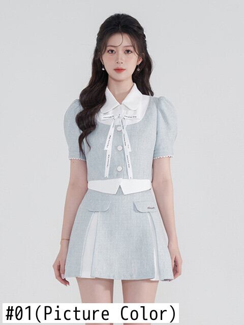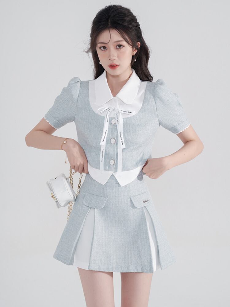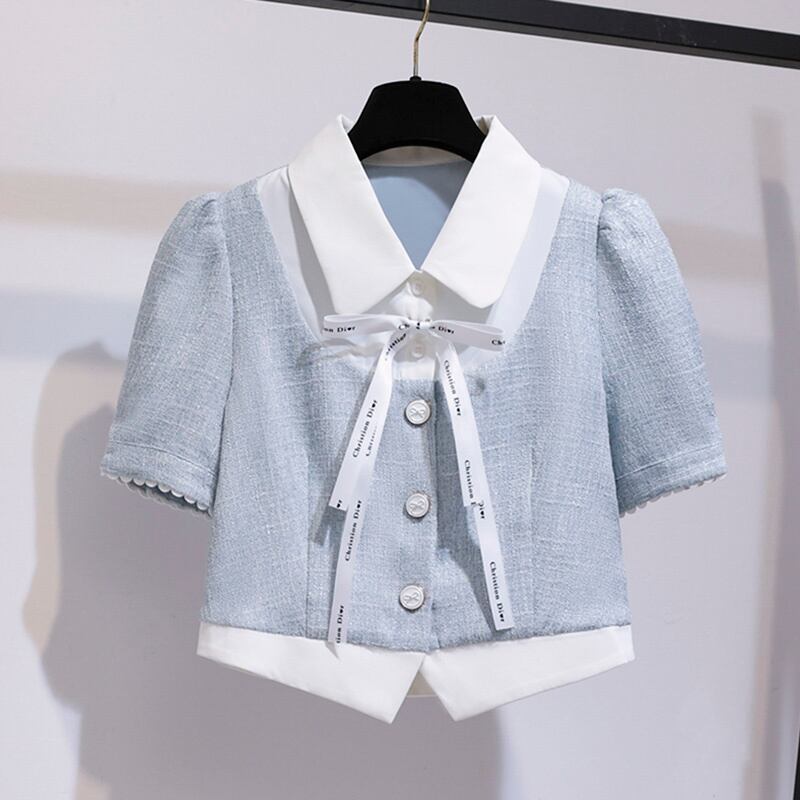プレッピースタイル甘いツーピースセットシャツクロップトップ + スカートセット夏小さな香り 2 ピース衣装 大人ガーリー スウィート キュート カジュアル サマー 夏物