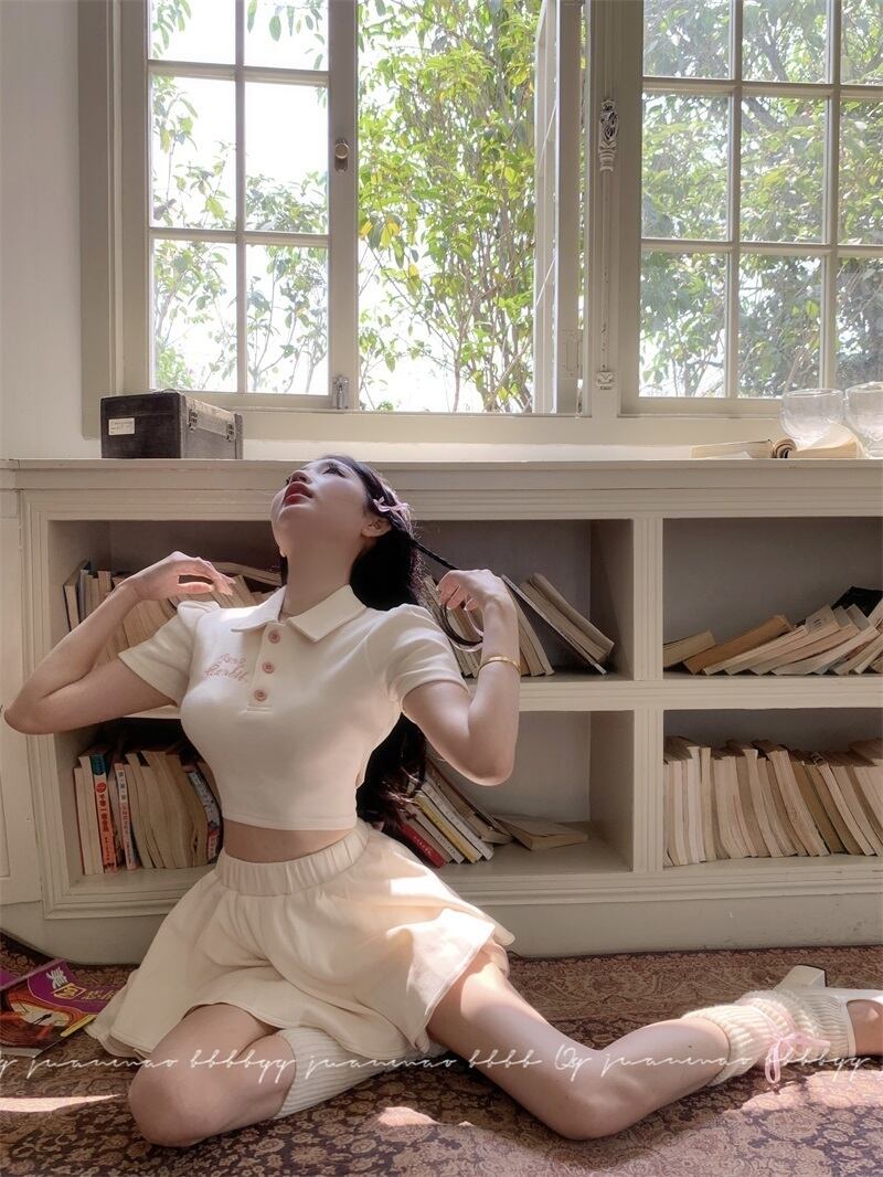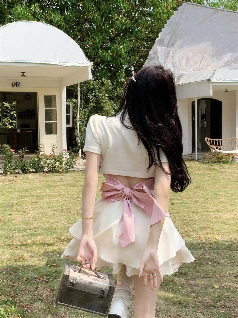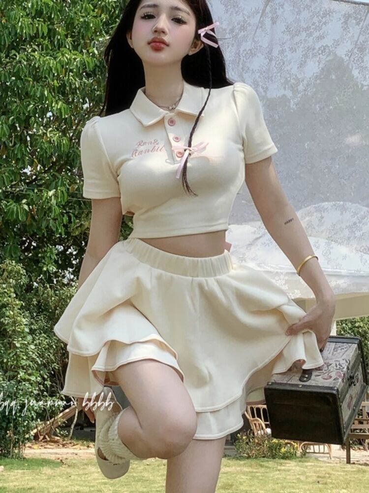 プレッピースタイル夏 2 ピースセット Tシャツクロップトップ + ケーキスカートセット女子スリムツーピーススーツ サマー 夏物