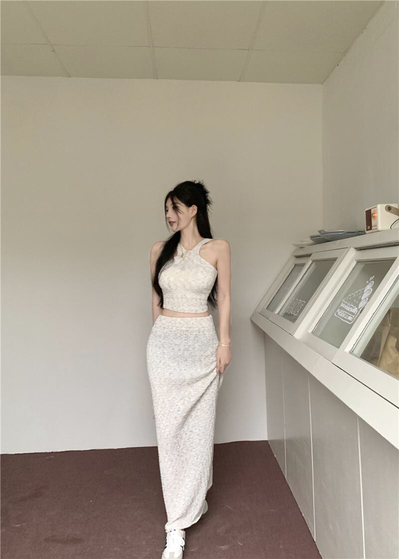 シックなニット 2 点セットセクシーなホルター ベスト トップ + ロング スカート セット女子夏フレンチ セーター ツー ピース スーツ サマー 夏物