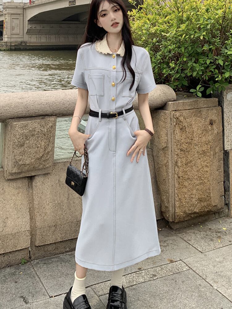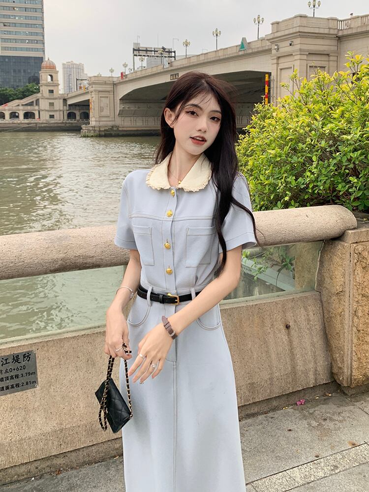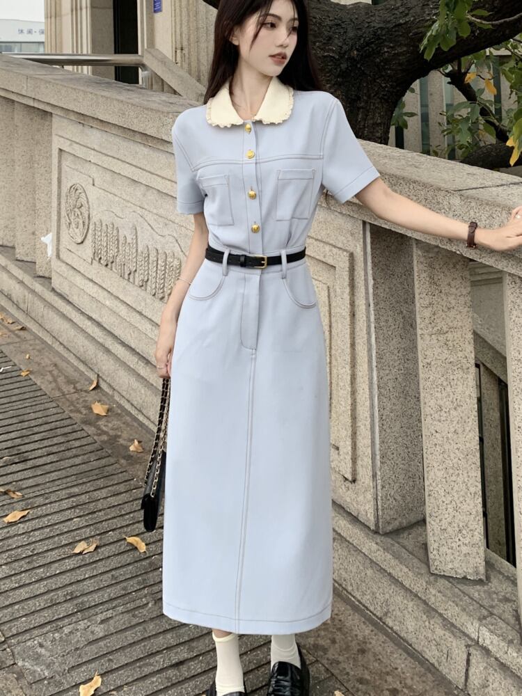 ドールネック半袖サマードレスプレッピースタイルライトブルー半袖ロングドレスベルト付き ショート ハーフスリーブ 夏物 ハーネス