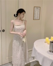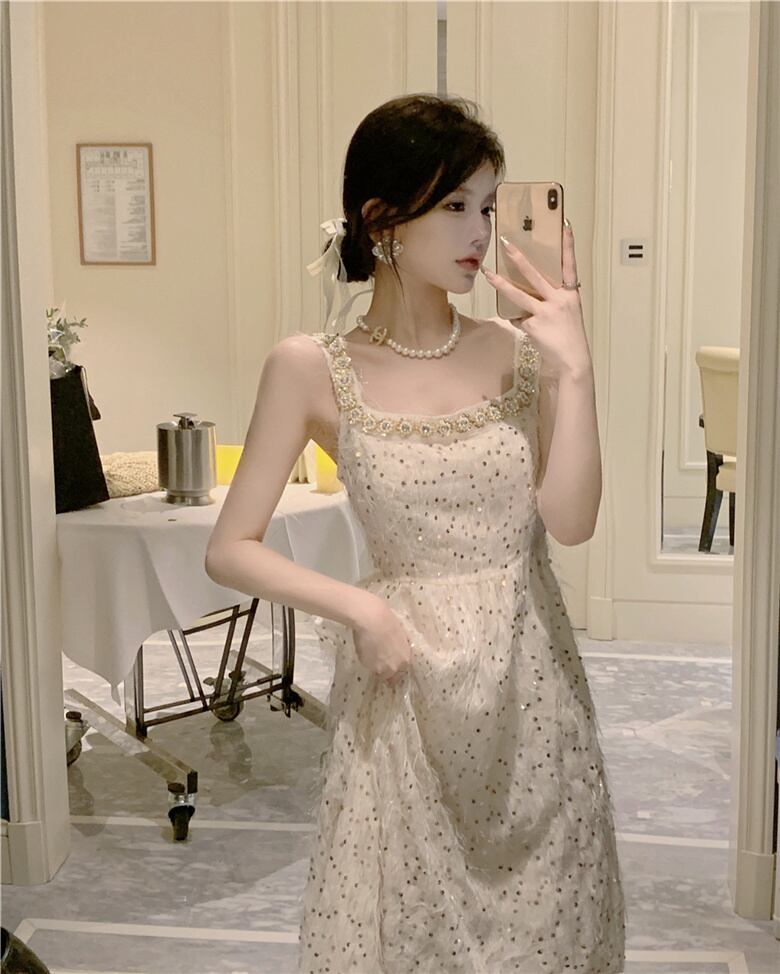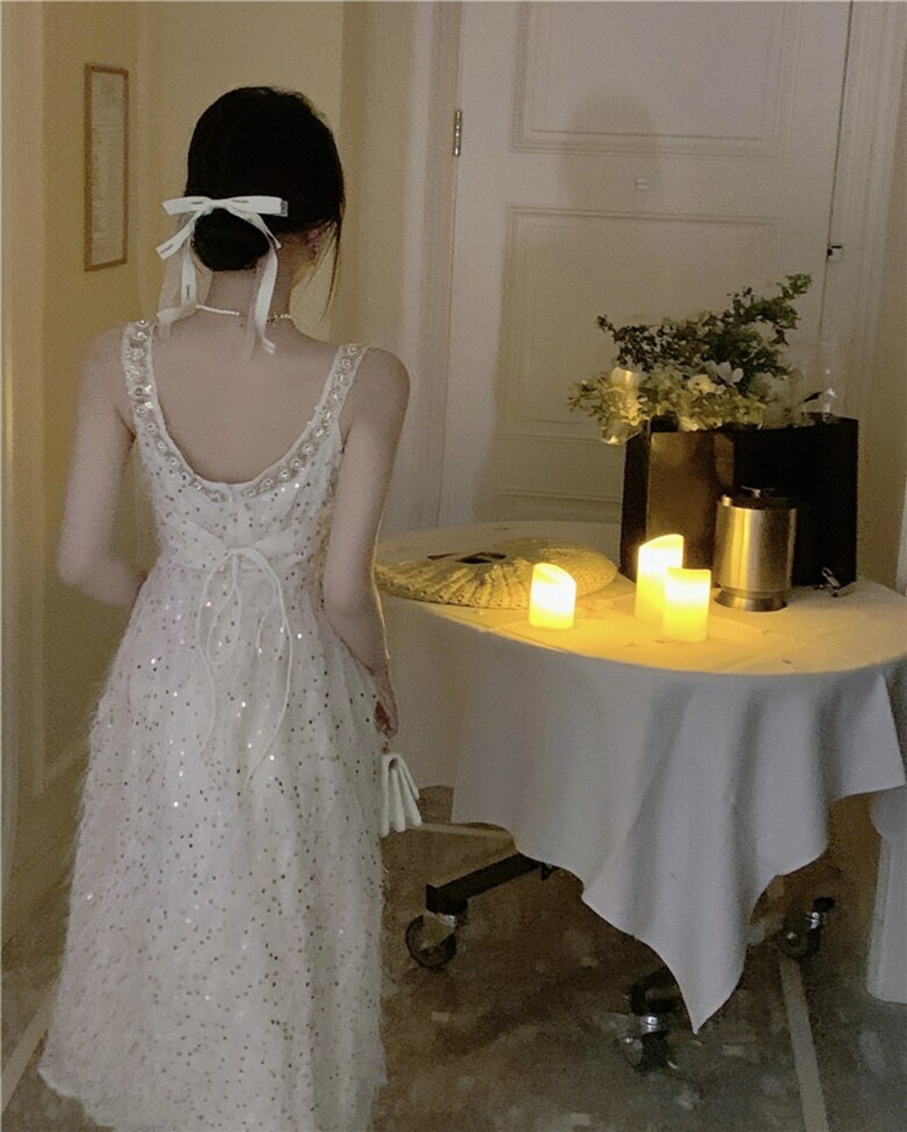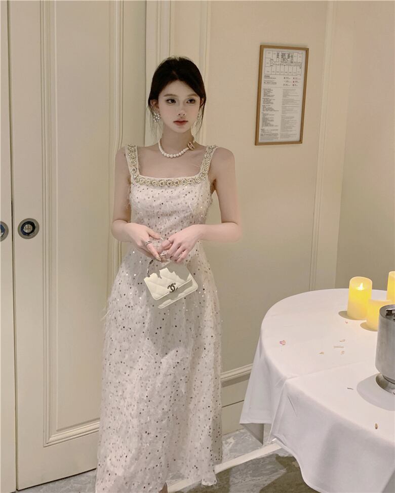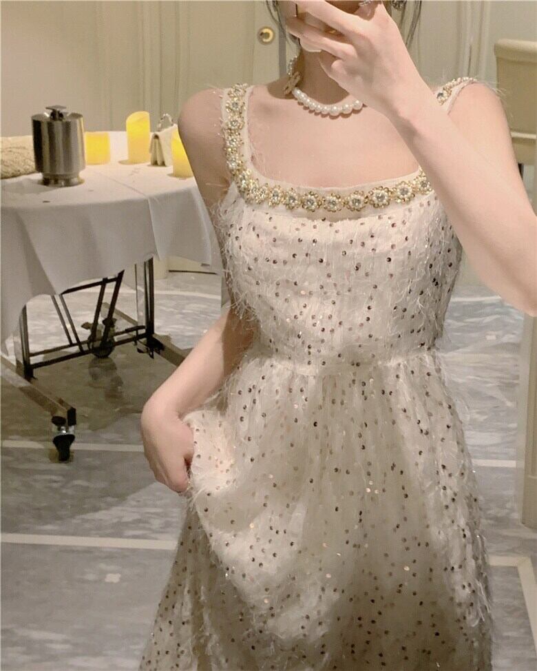 フランス高級羽スパンコールスリムウエストサマードレスノースリーブ V ネックセクシー背中開いたパーティーロングドレスローブ 夏物 Vネック