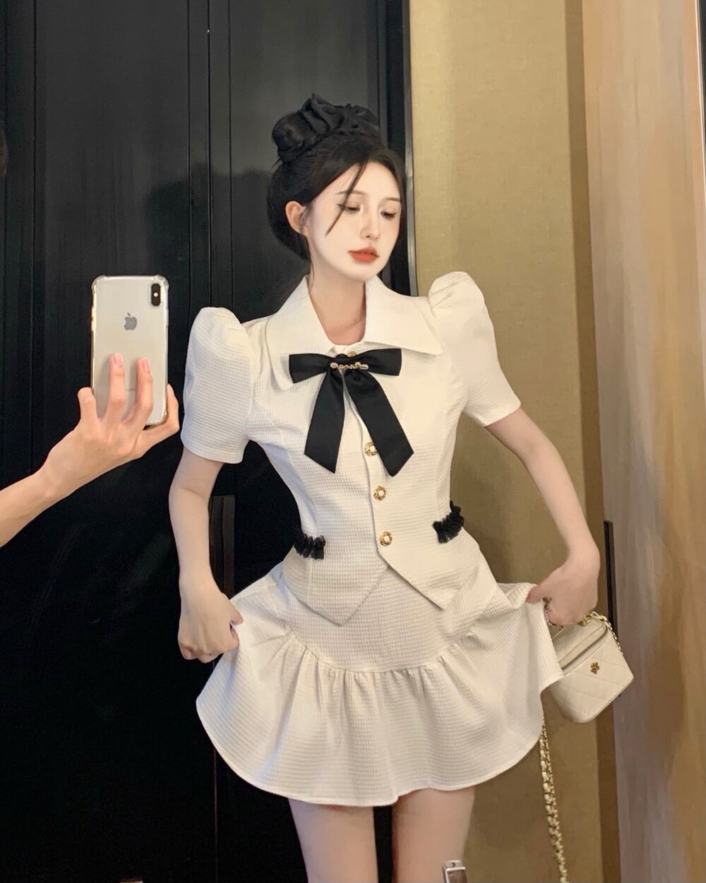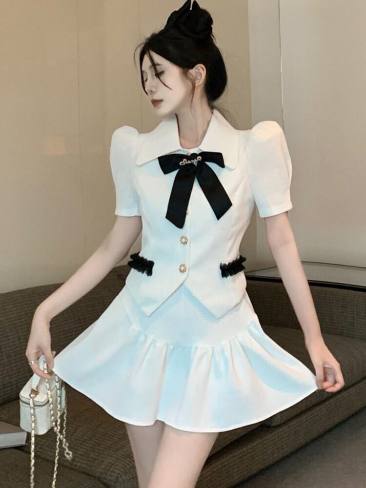 甘いかわいいツーピースセット弓クロップトップ + ミニスカートスーツ夏小さ香り 2 点セット衣装 リボン 大人ガーリー スウィート キュート カジュアル サマー 夏物