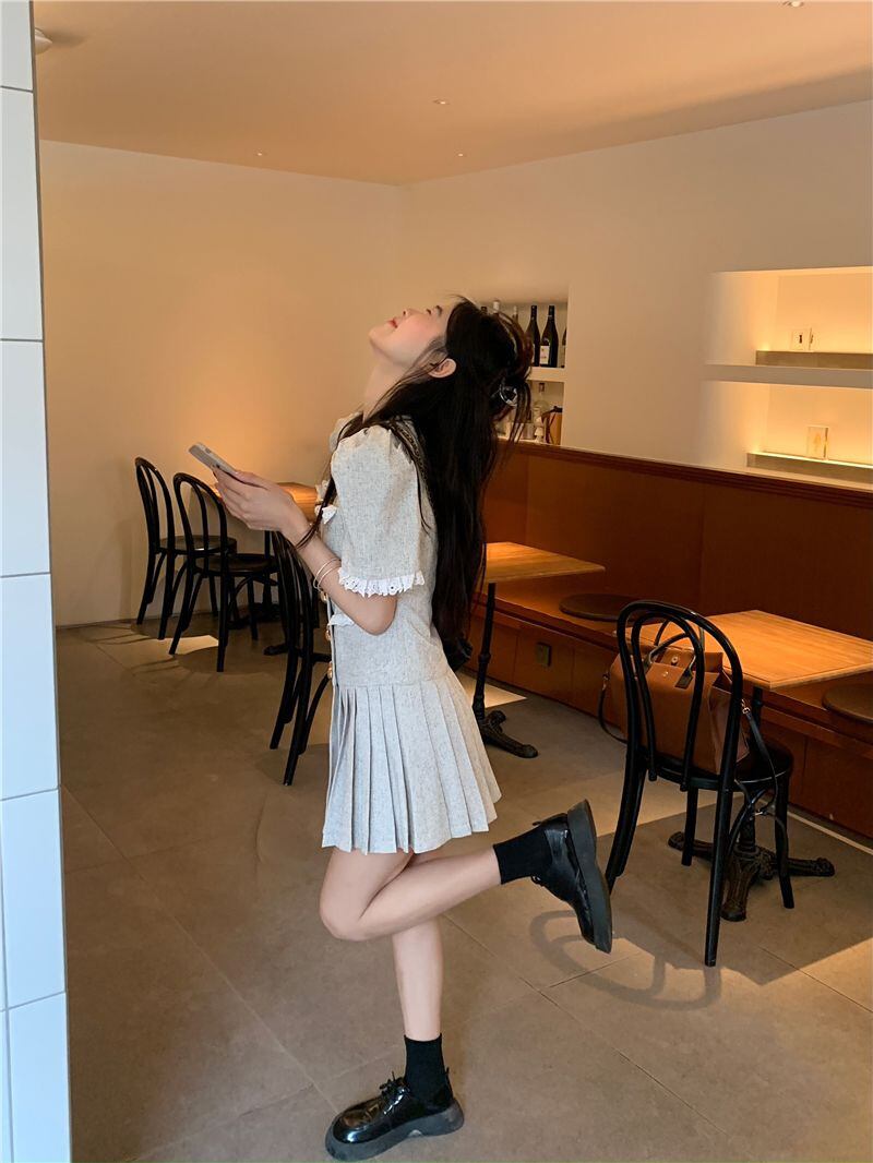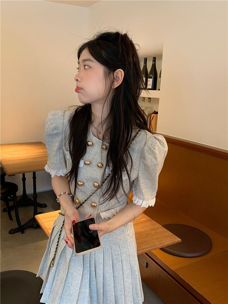 小さ香りサマードレスダブルブレストレースパッチワークスリムプリーツドレスフレンチパーティー Vestidos 夏物