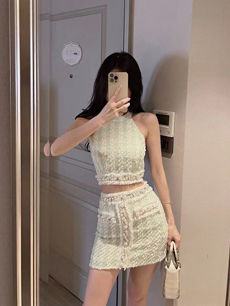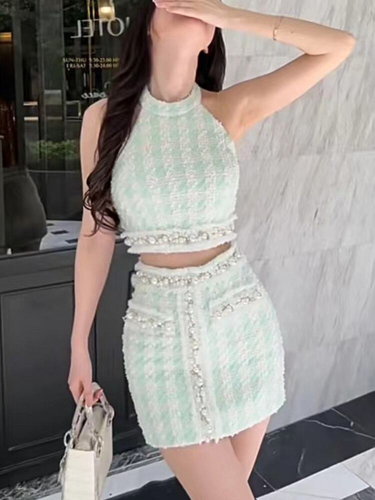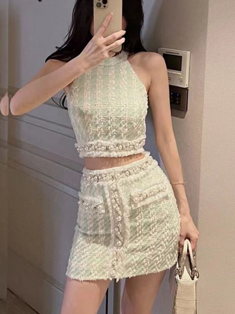 フランス高級ビーズ小さ香りツイード 2 点セットセクシークロップトップ + スカートスーツ夏チェック柄 2 点セット サマー 夏物