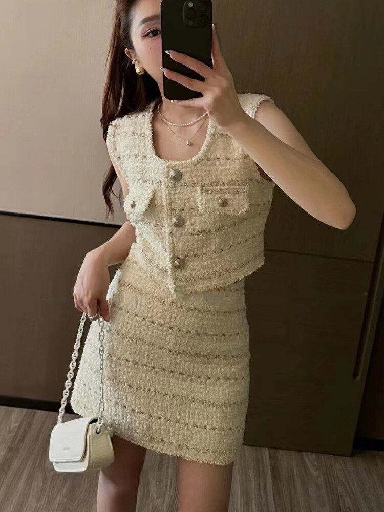ストリート小さ香りツイードツーピースセットセクシータンククロップトップ + ミニスカートスーツ Y2k ストリート 2 ピースセット