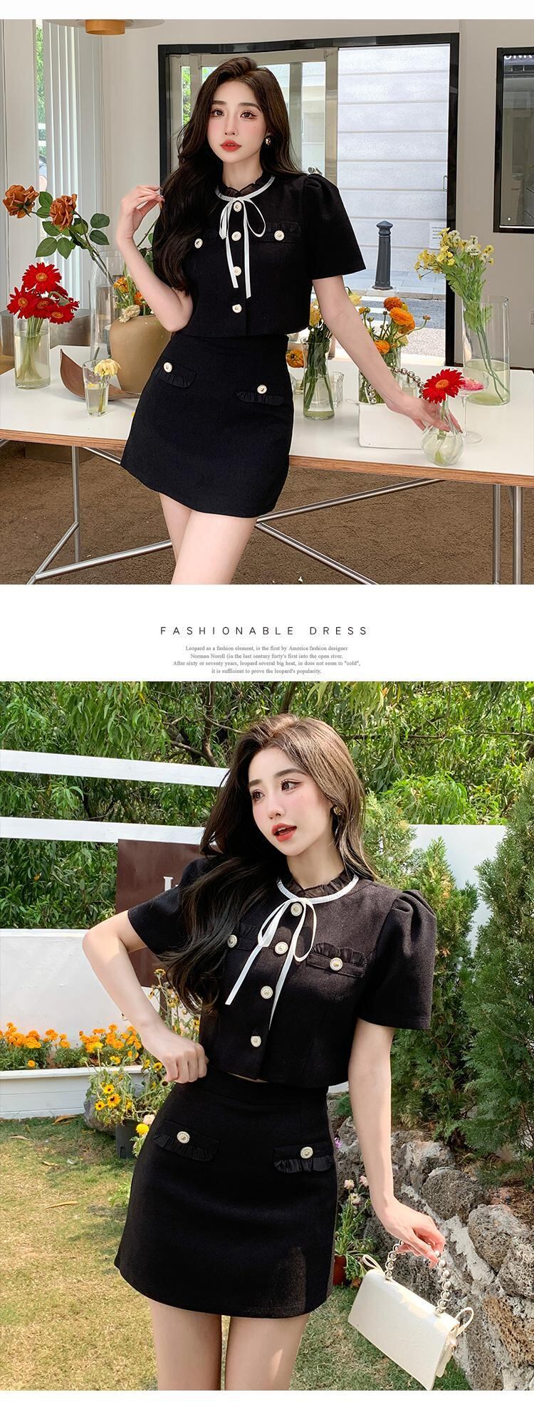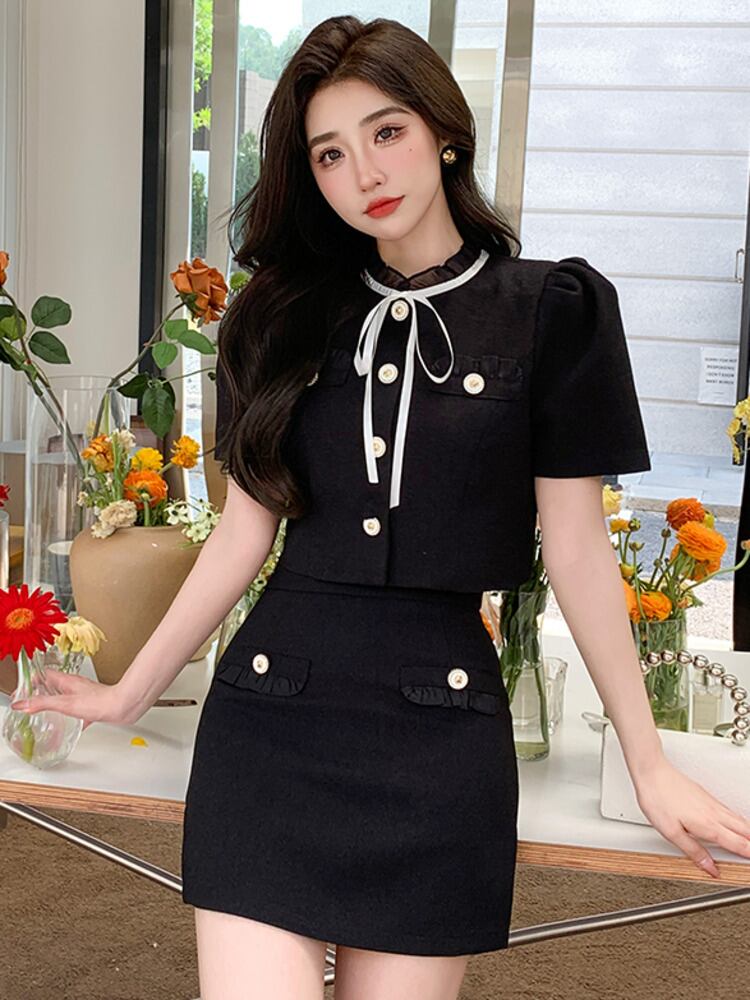 小さフレグランス 2 点セットボウ シャツ クロップ トップ + ウエスト スカート セット 2 ピース スーツ リボン