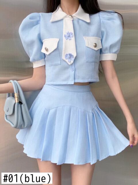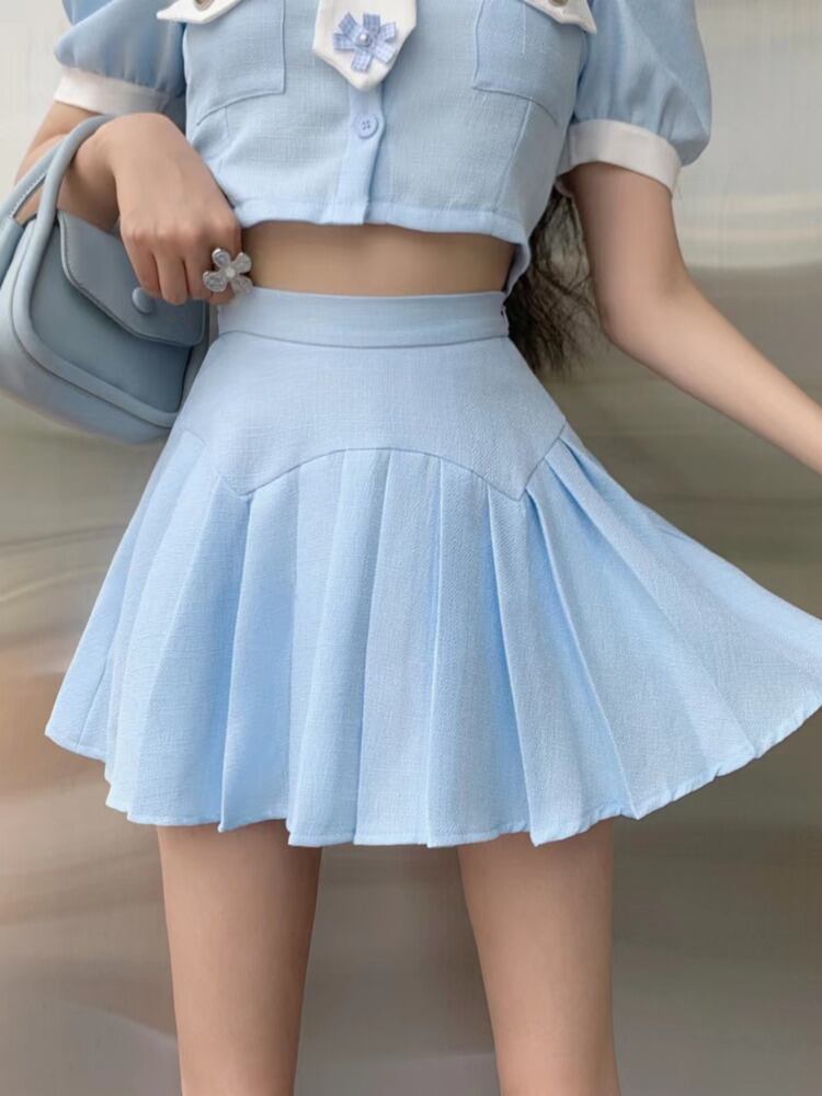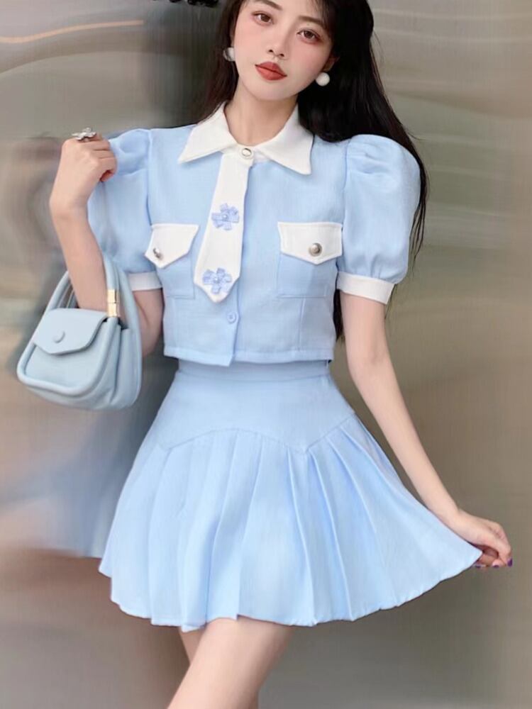 夏衣装バブルスリーブクロップトップ & プリーツスカートツーピースセット甘い 2 ピーススーツ 大人ガーリー スウィート キュート カジュアル サマー 夏物