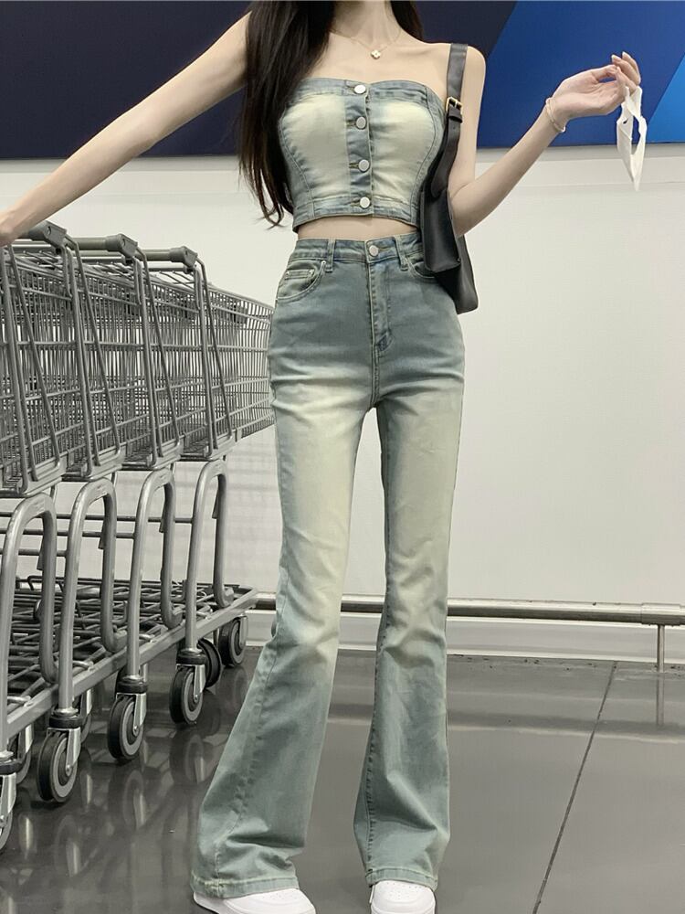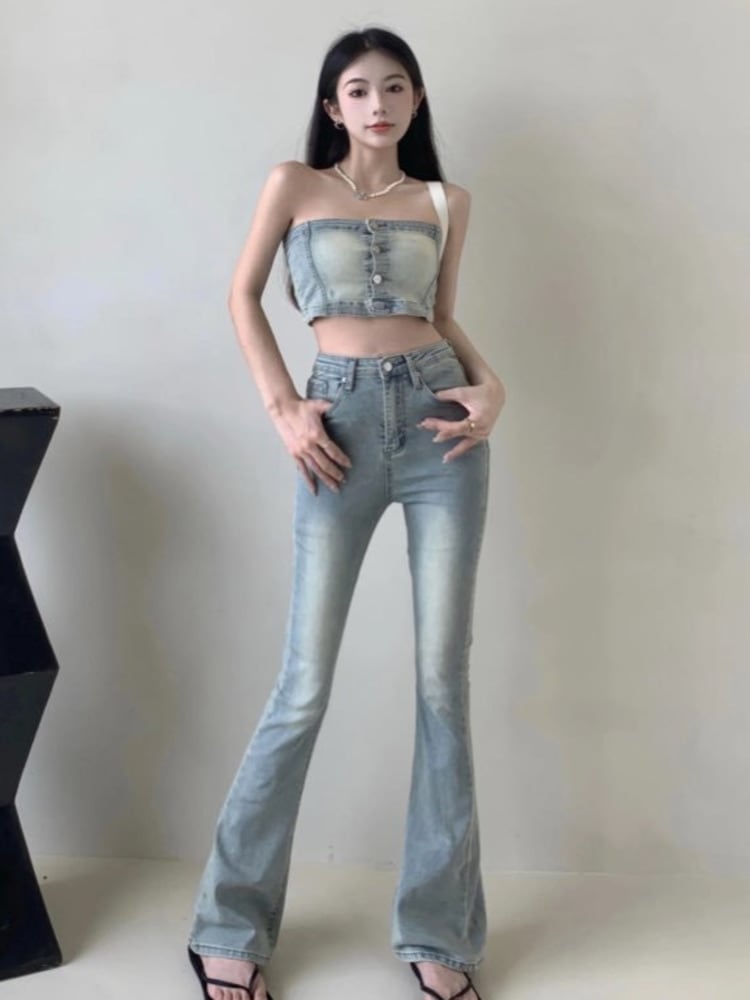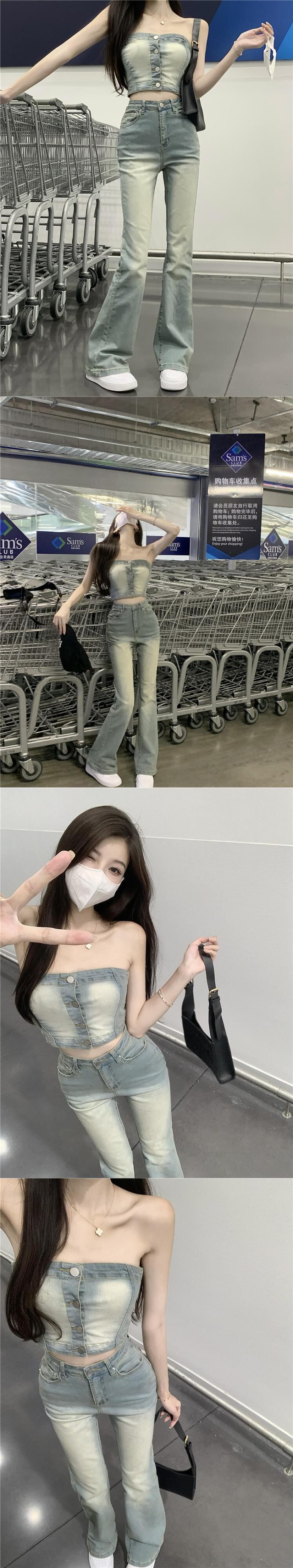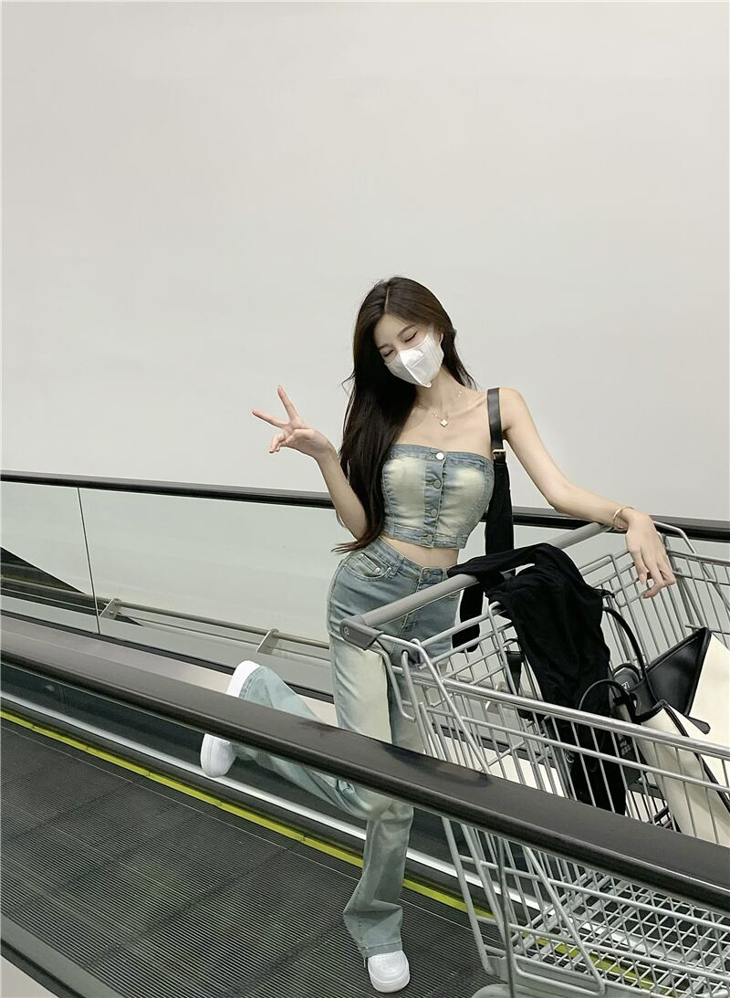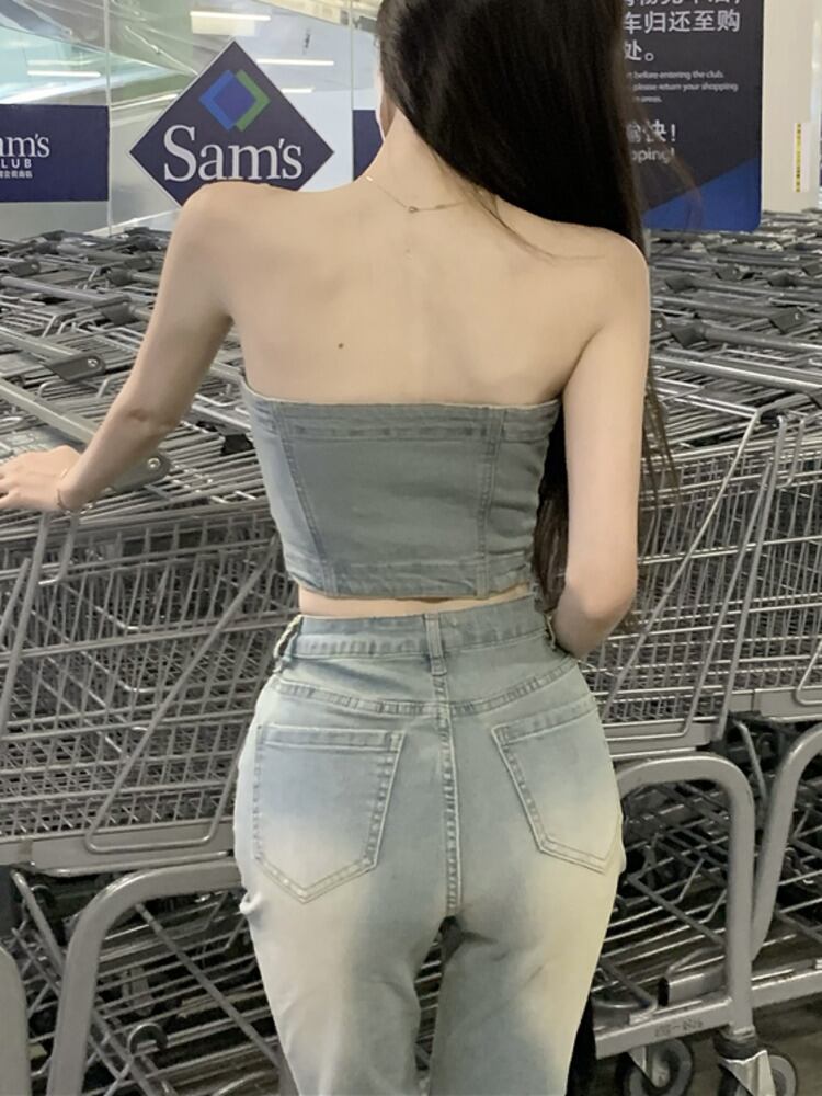 Girl HotSweet デニムツーピースセットノースリーブセクシーブラクロップトップ + ウエストジーンズ 2 ピースパンツセット 大人ガーリー スウィート キュート カジュアル