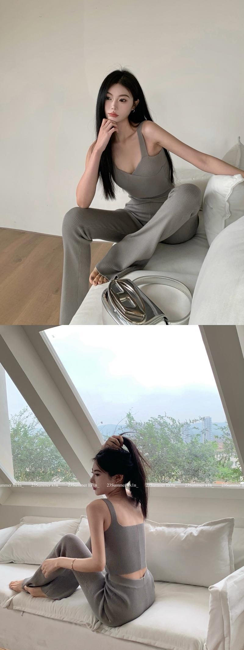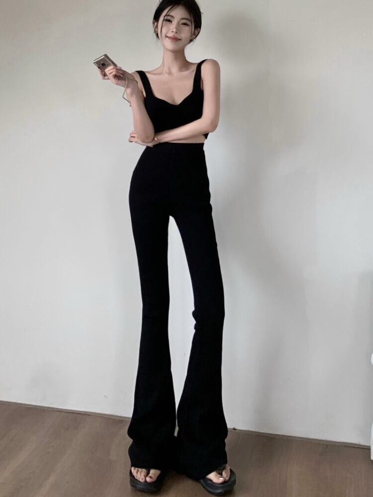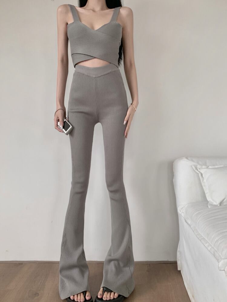 シンプルニットトラックスーツツーピースセットノースリーブベストクロップトップ + パンツセットズボン夏 2 ピース衣装 サマー 夏物