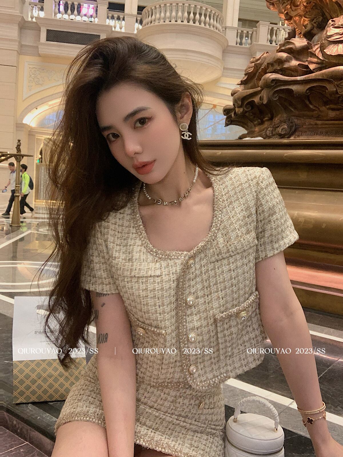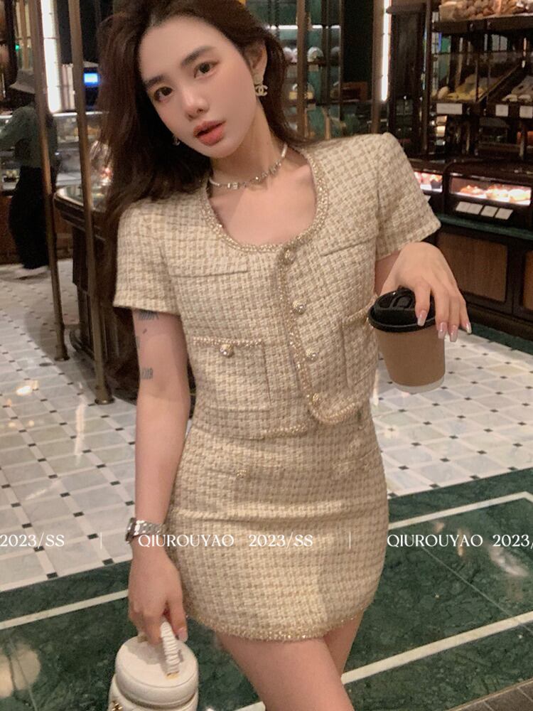 夏スモールフレグランス 2 点セットクロップトップ + ショートスカートスーツ conjuntos cortos 2 点セット衣装 サマー 夏物