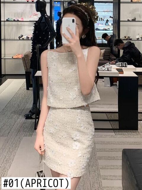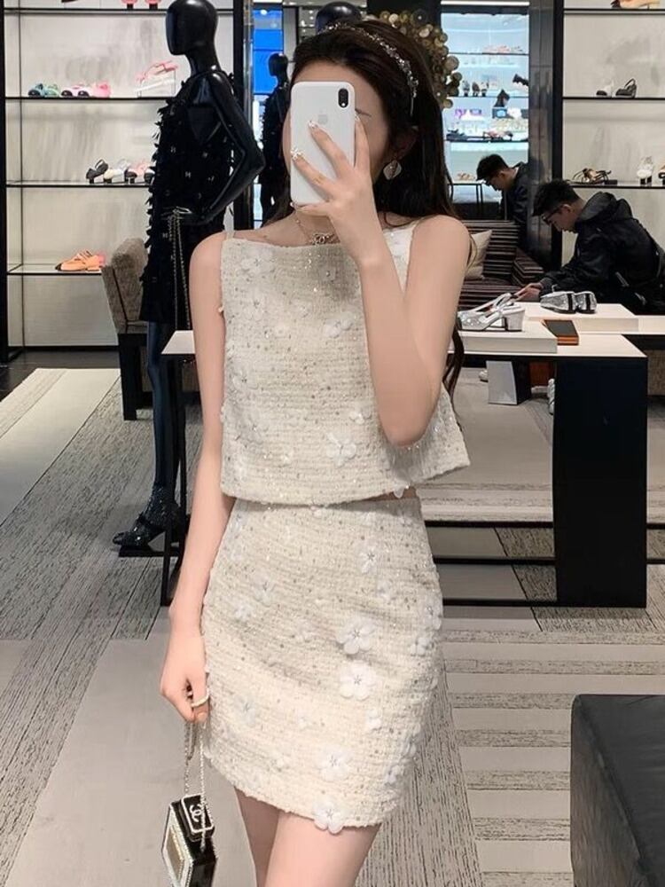 フレンチスモールフレグランスツーピースセットタンククロップトップ + スカートスーツ甘い夏 2 ピース衣装 大人ガーリー スウィート キュート カジュアル サマー 夏物