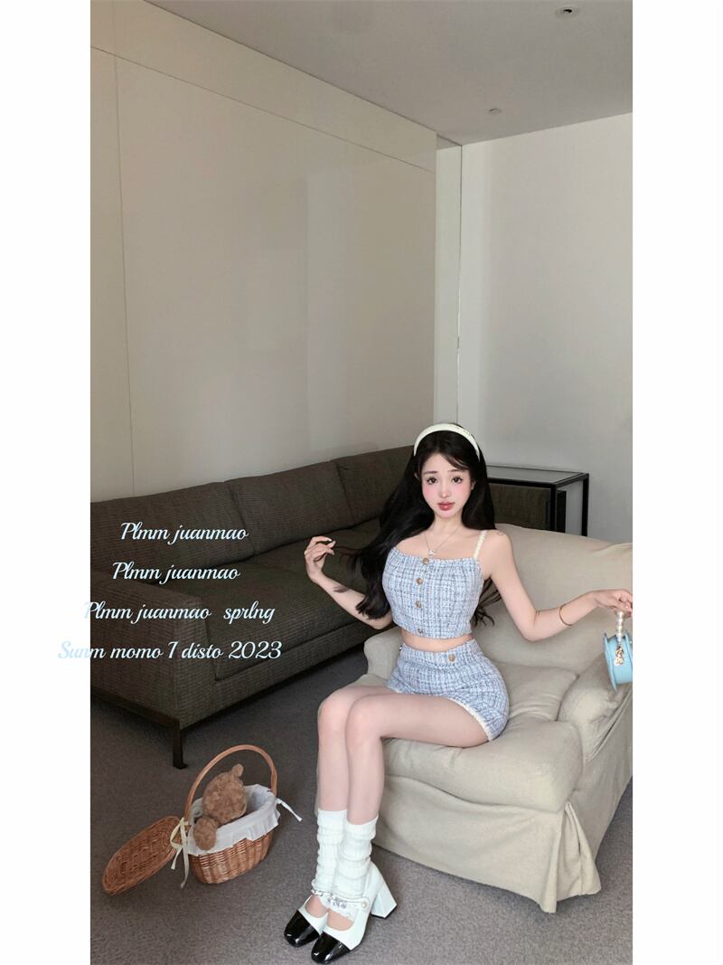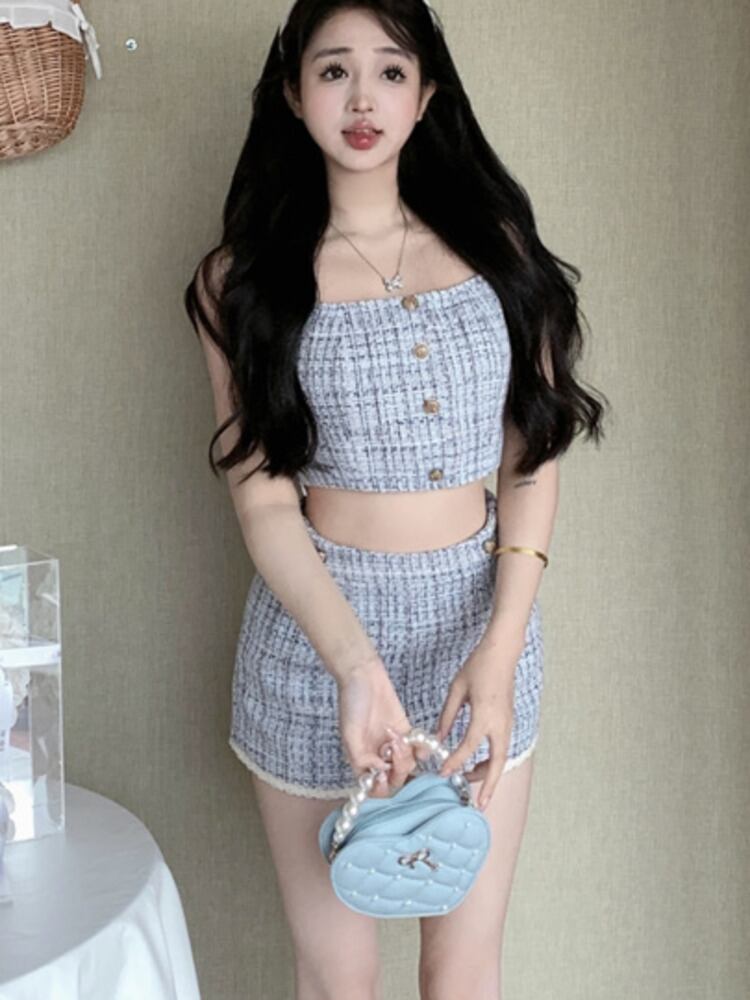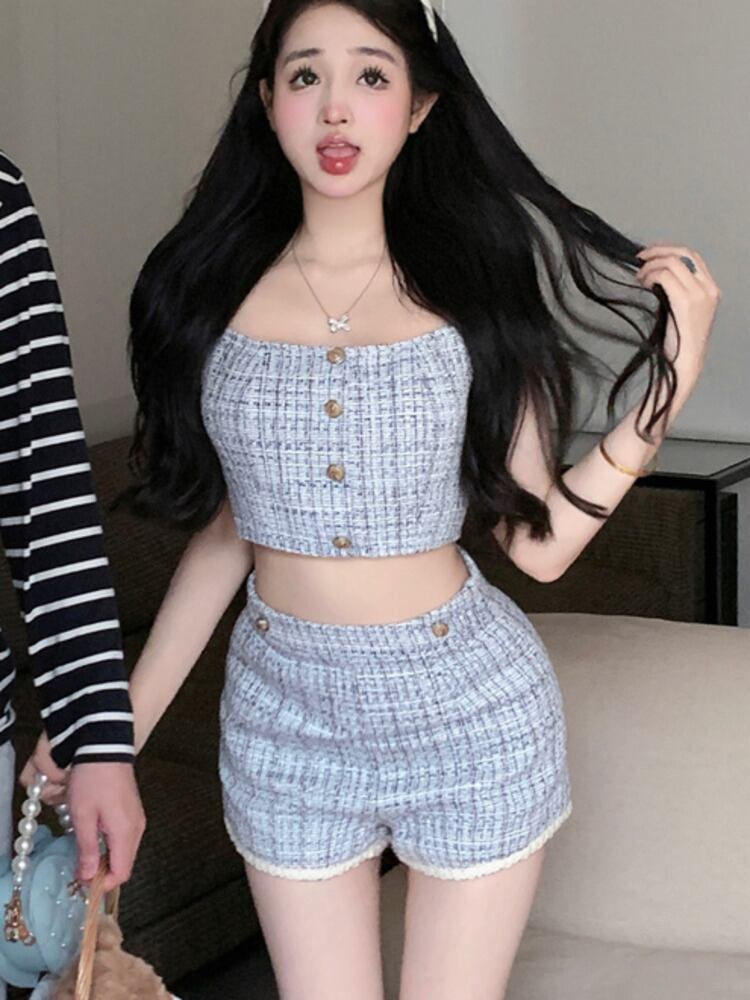 フランス小さ香りツイード 2 点セットタンク クロップ トップ + ショート スーツ Y2K 夏 2 ピース パンツ セット サマー 夏物