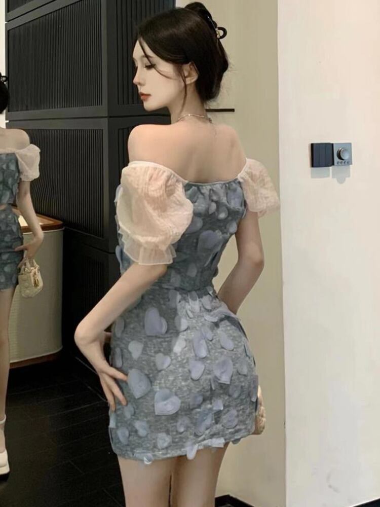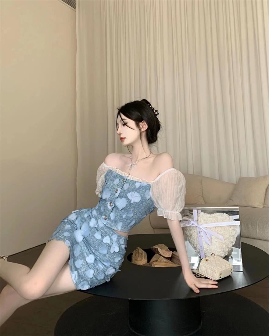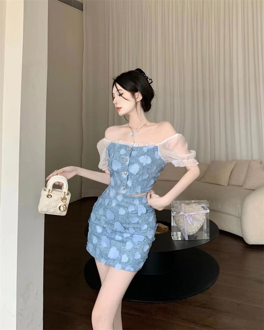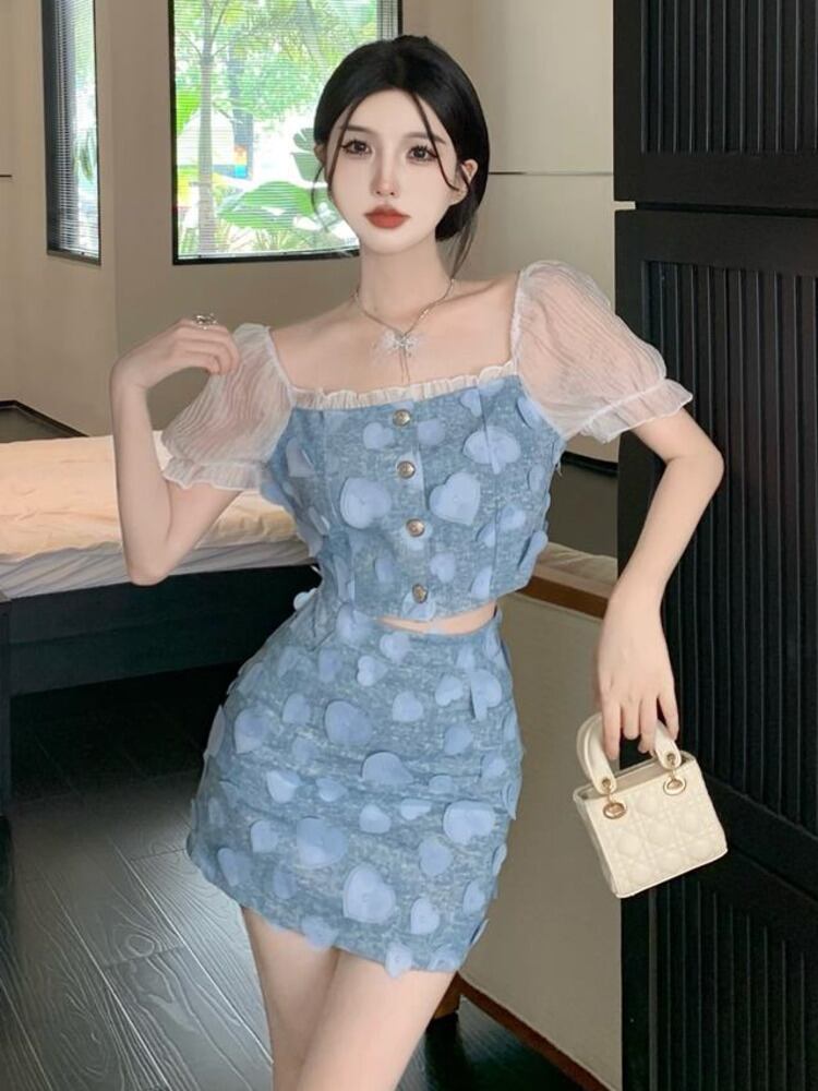 甘い 2 点セット衣装フレンチパッチワーククロップトップ + ミニスカートスーツ Y2K ストリート夏 2 点セット 大人ガーリー スウィート キュート カジュアル サマー 夏物