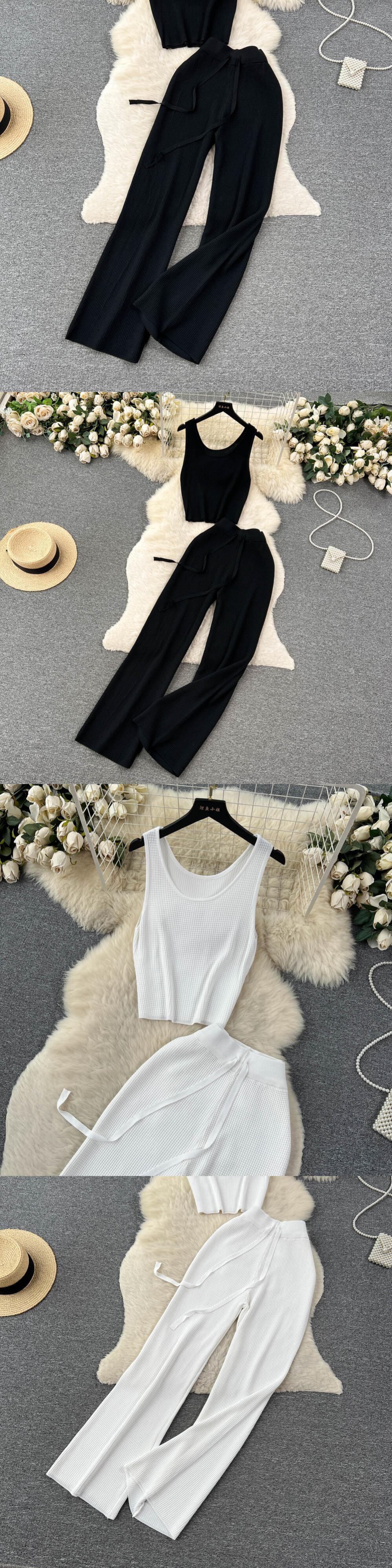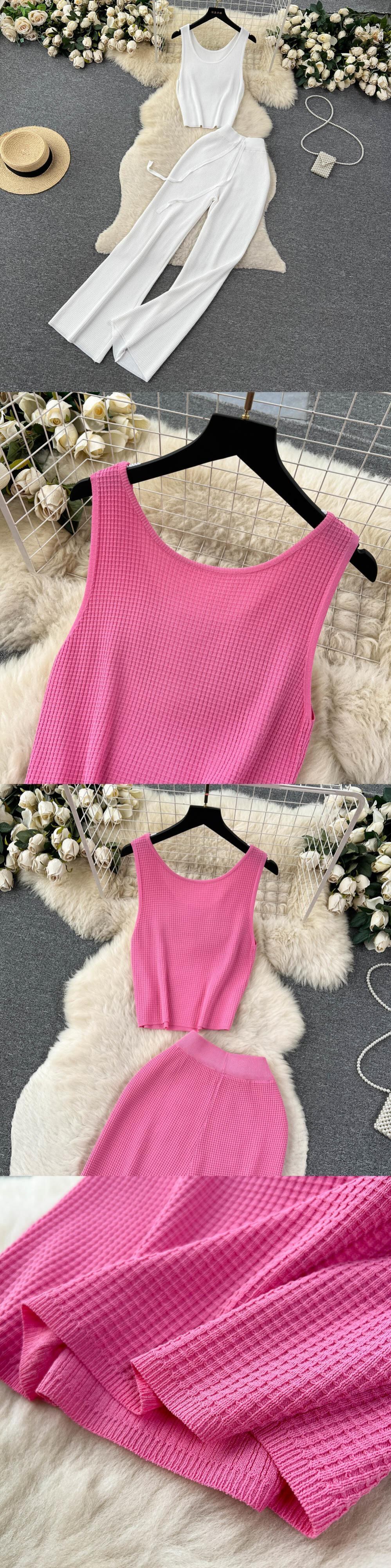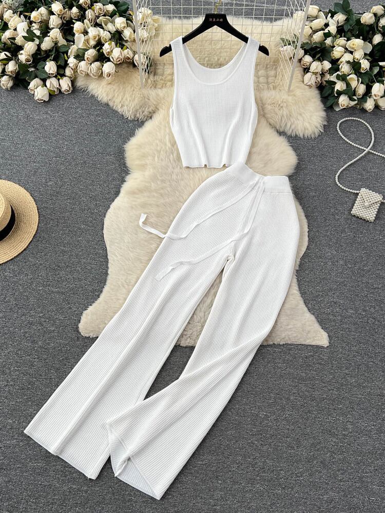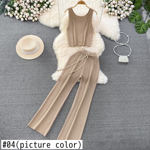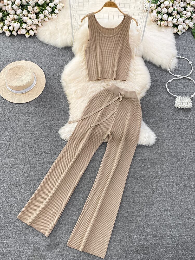 夏ニットツーピースセットノースリーブタンクトップ + 弾性ウエストロングパンツセットセータースーツ エラスティック 伸縮 サマー 夏物