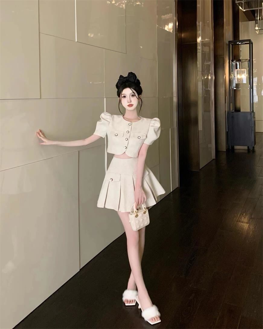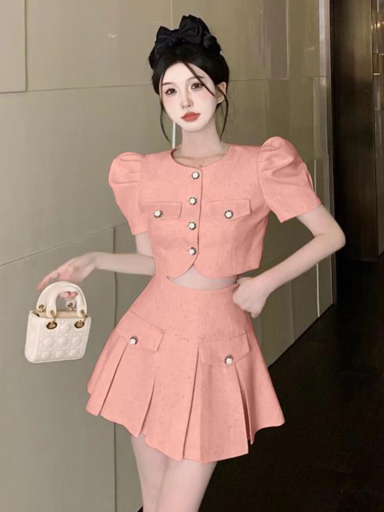 ストリートフレンチスモールフレグランスツーピースセットジャケットコート+プリーツスカートセットスウィート2ピーススーツ 大人ガーリー キュート カジュアル