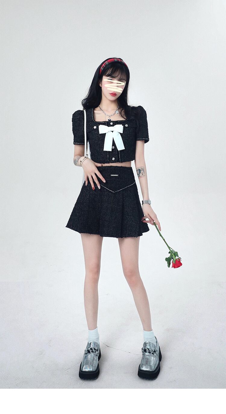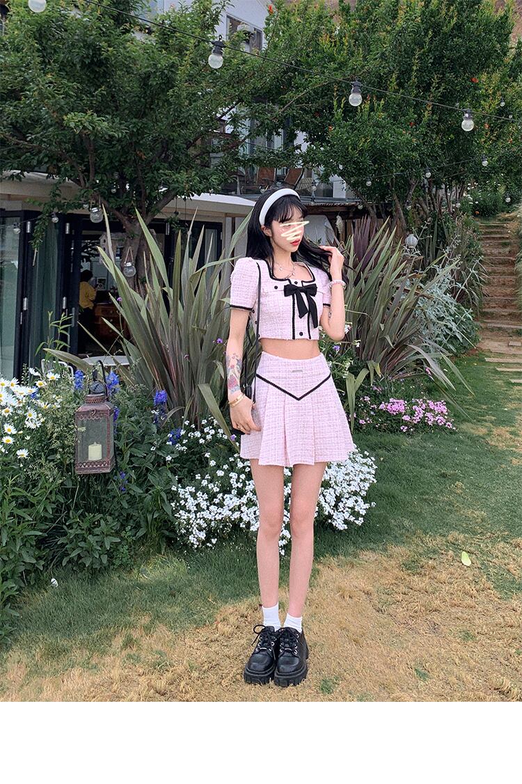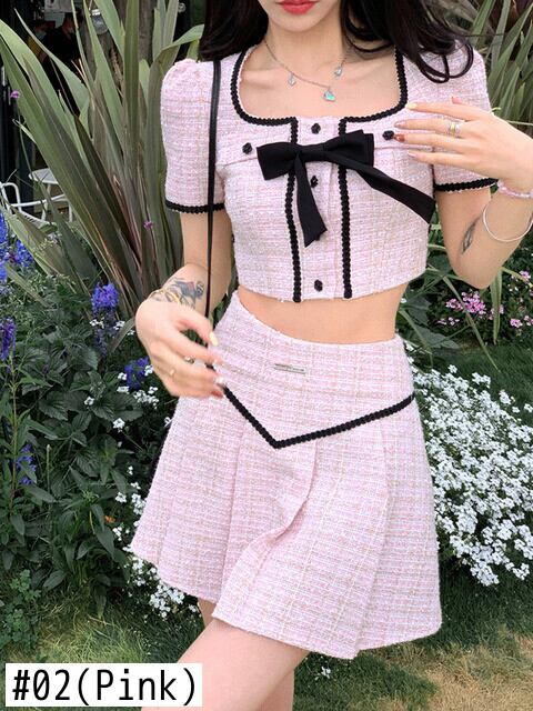 夏スモールフレグランスツイード 2 点セット弓ショートジャケットコート + プリーツスカートスーツ甘いツーピースセット リボン 大人ガーリー スウィート キュート カジュアル サマー 夏物