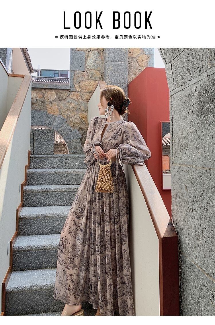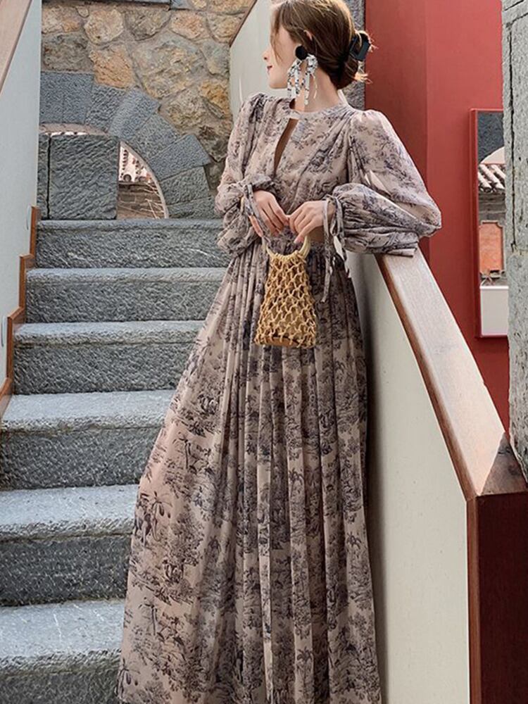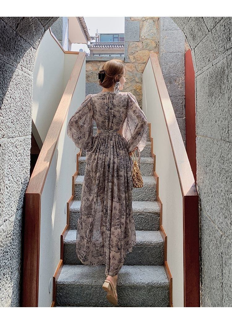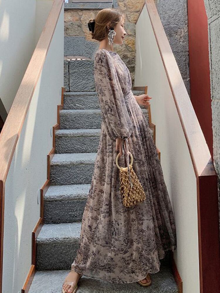 フランス花柄マキシロングドレス長袖パーティーサマードレスホリデービーチ自由奔放生きるシフォンドレス 夏物
