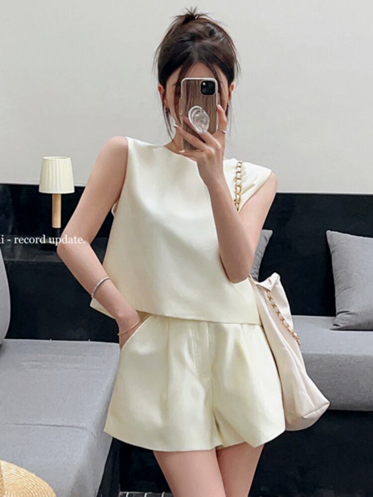 ストリート フレンチ Y2K ストリート ツー ピース セットノースリーブ トップ + ショート スーツ夏 2 ピース パンツ セット サマー 夏物