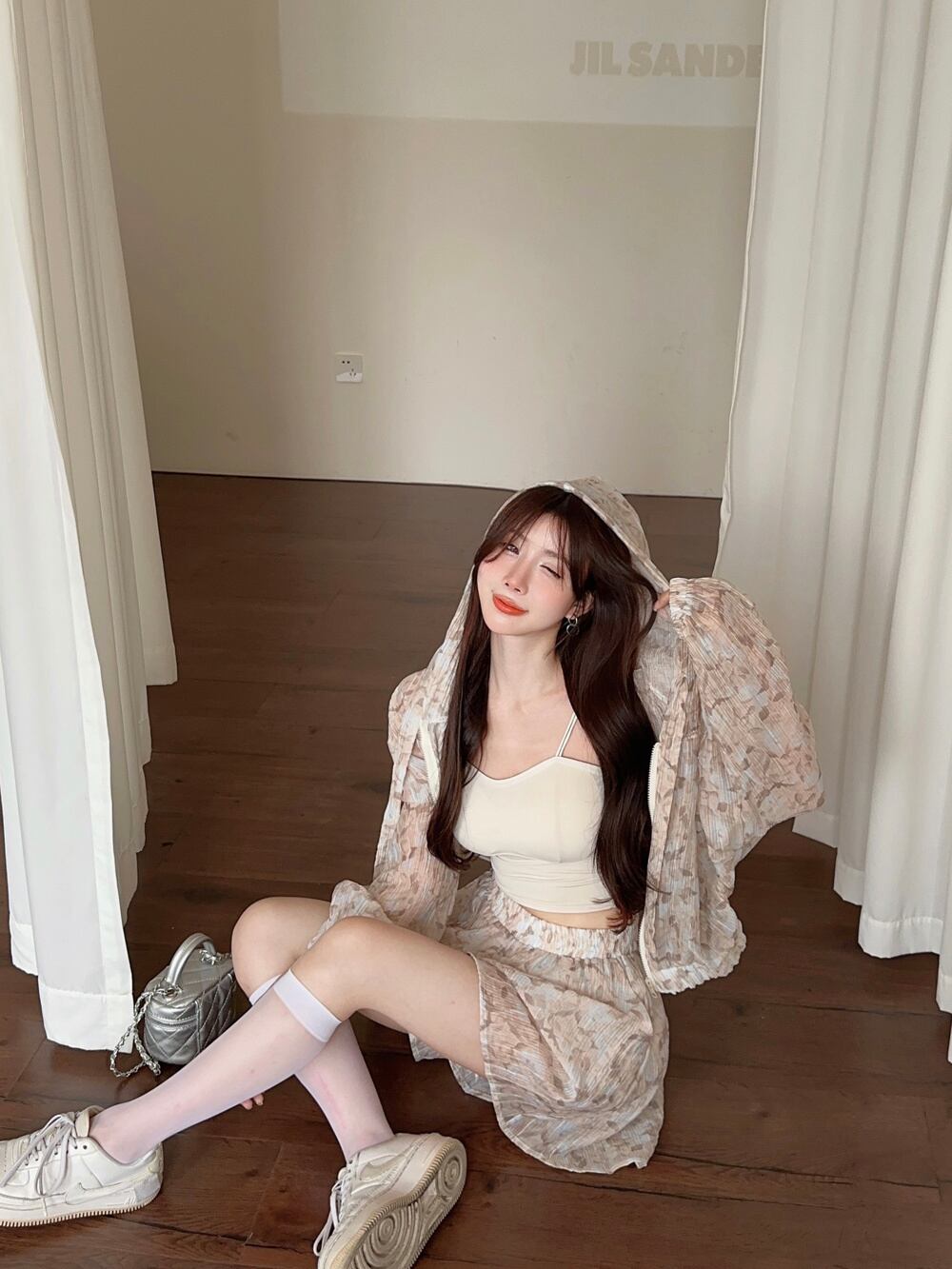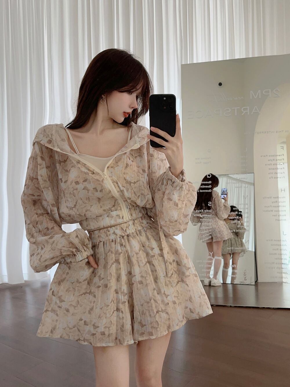 プリントフード付きジッパーサンプロテクションコート+ワイドレッグショートセット夏服装休日ビーチ服装パンツセット サマー 夏物 ワイドパンツ