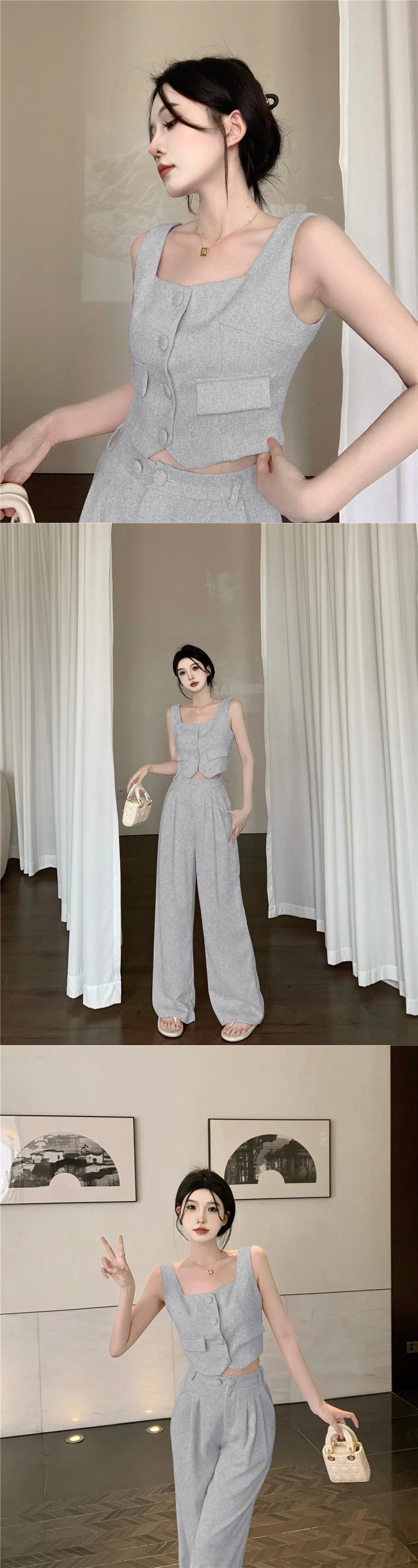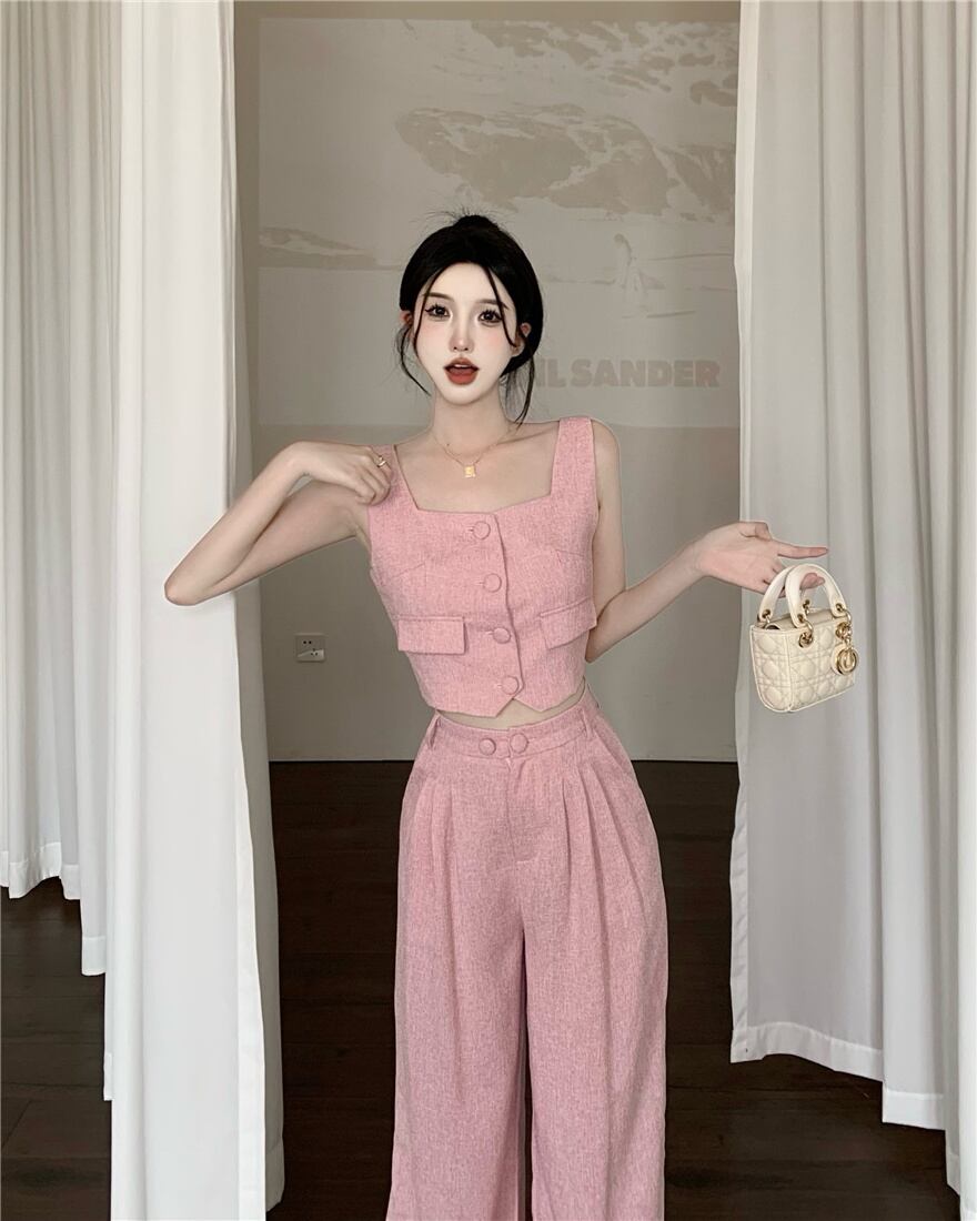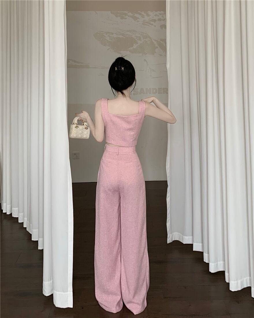 ストリートスモールフレグランスツーピースセットスウィートベストクロップトップ & ワイドレッグパンツセットフレンチ 2 ピーススーツ 大人ガーリー キュート カジュアル ワイドパンツ