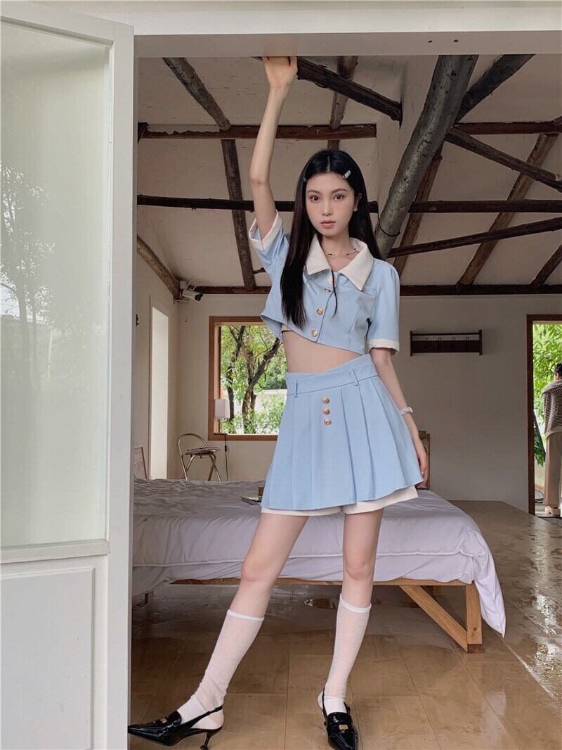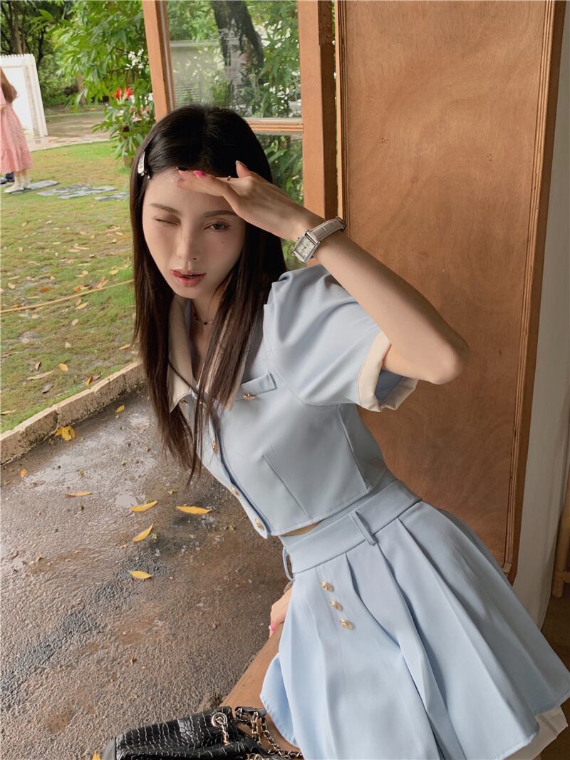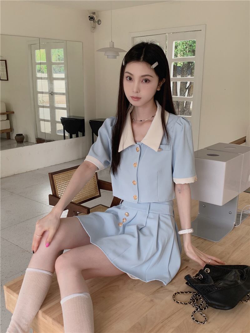 甘いツーピースセットショートジャケットコート + ウエストプリーツミニスカートスーツプレッピースタイル夏 2 ピース衣装 大人ガーリー スウィート キュート カジュアル サマー 夏物