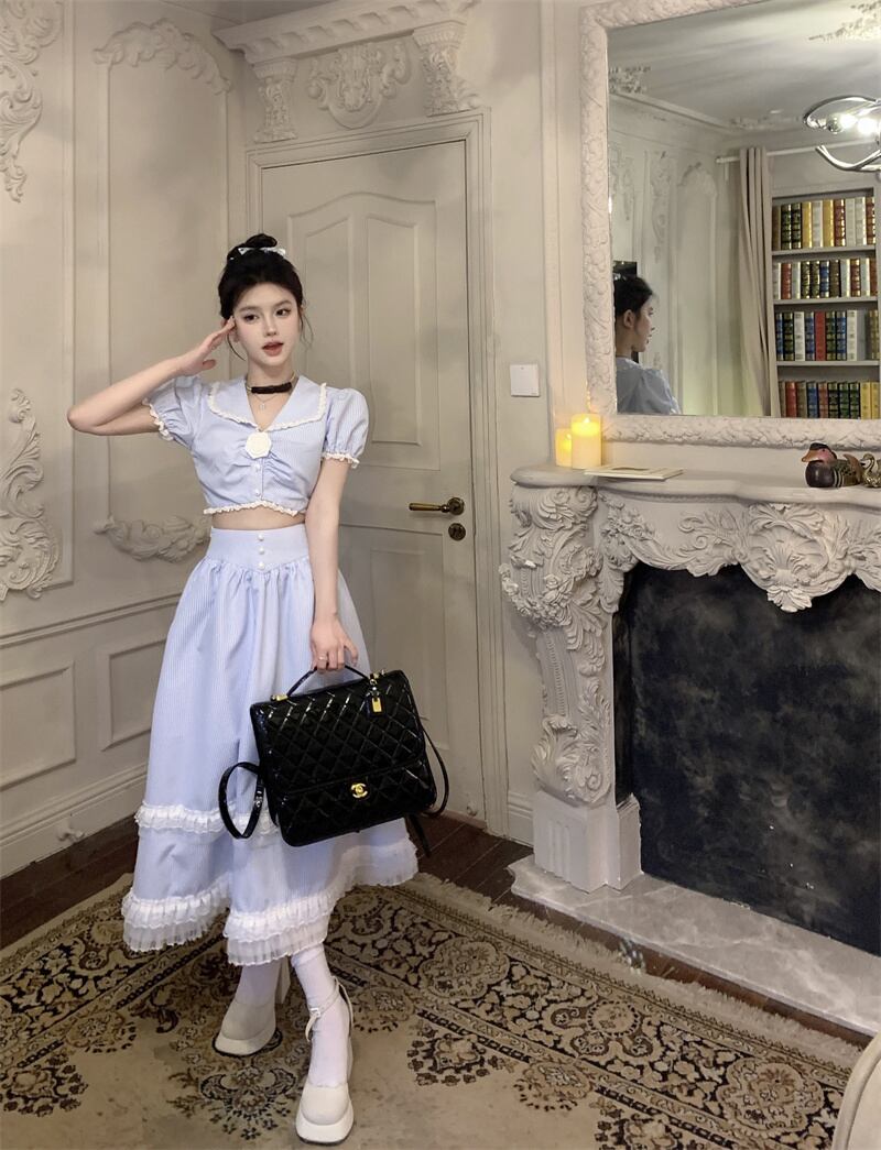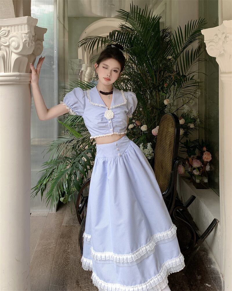 フレンチビーチホリデーツーピースセットシャツクロップトップ+ロングスカートスーツ夏2ピース衣装 サマー 夏物