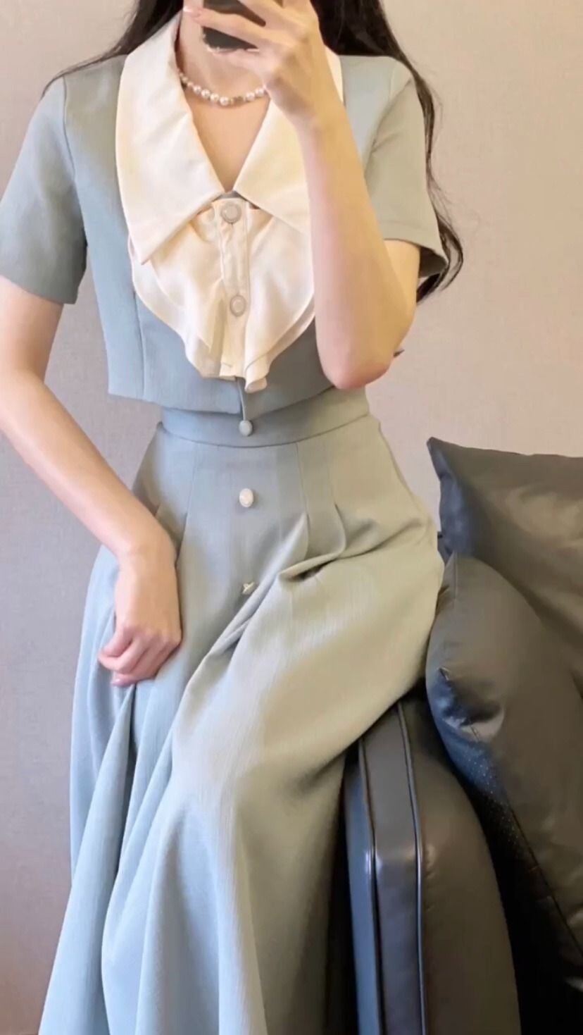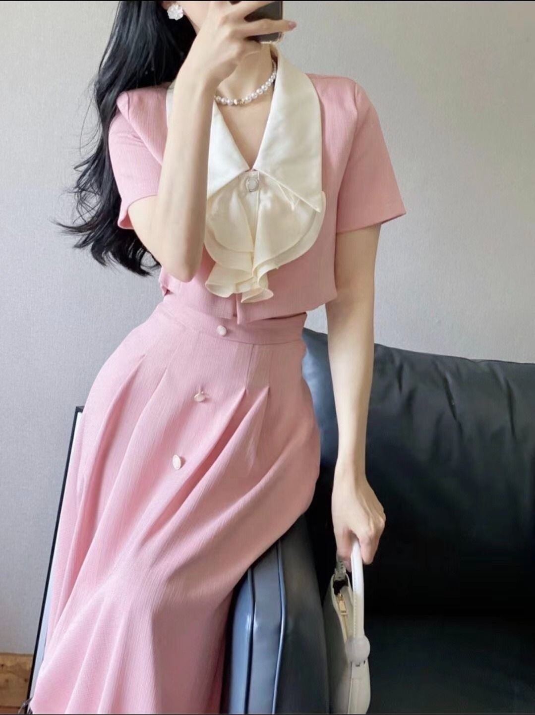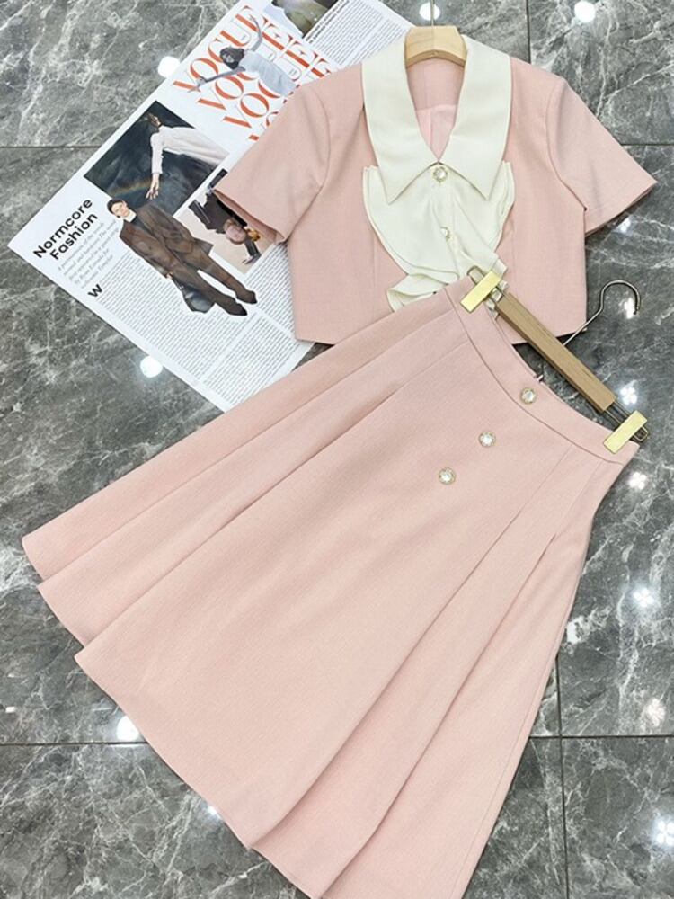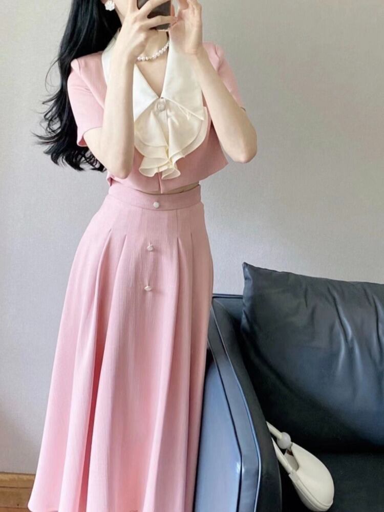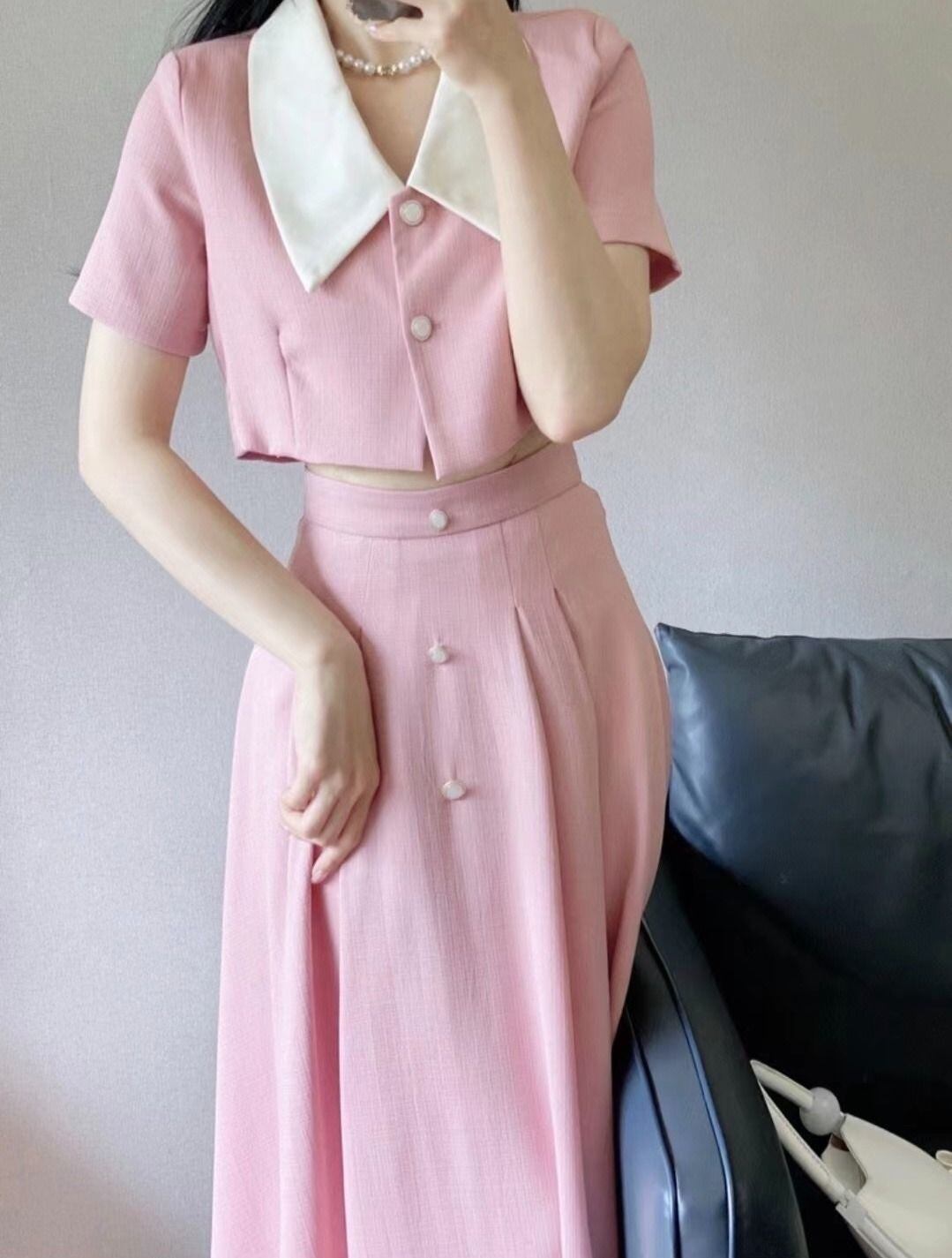 スイートスモールフレグランスツーピースセットレディースシャツクロップトップ+ロングスカートスーツOL 2点セット 大人ガーリー スウィート キュート カジュアル