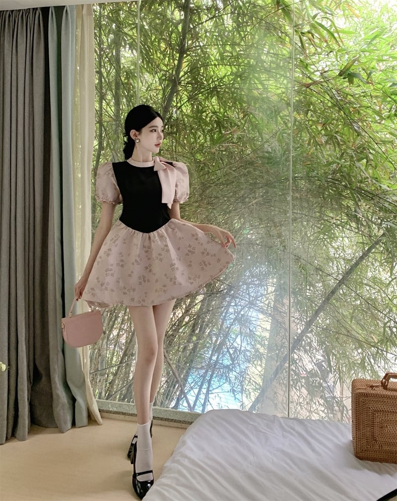 フレンチスイートジャカードミニサマードレスシックリボンスリムウエストミニショートパーティードレス 大人ガーリー スウィート キュート カジュアル 夏物