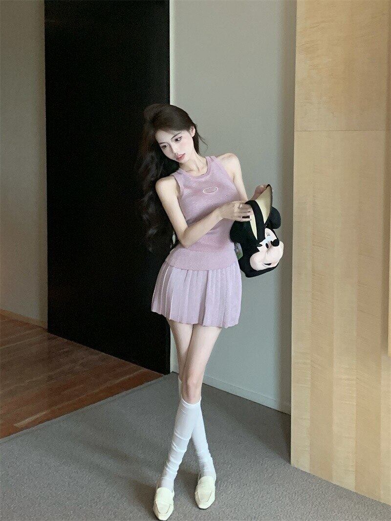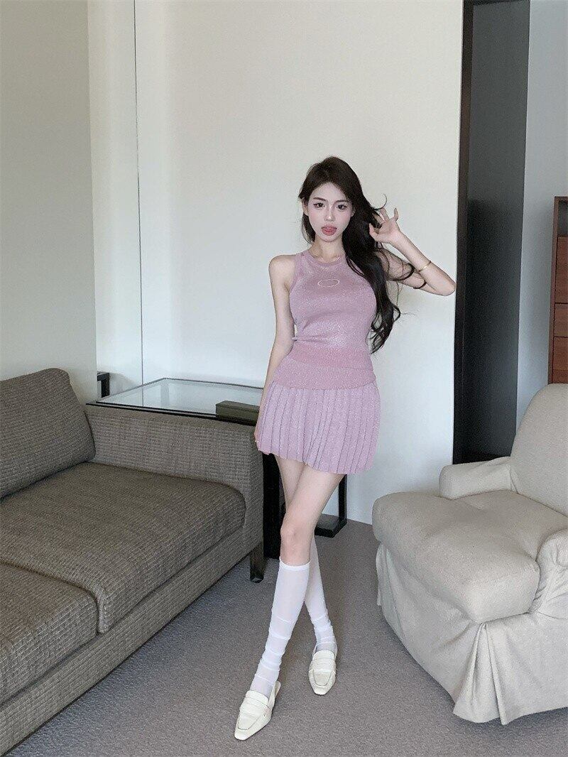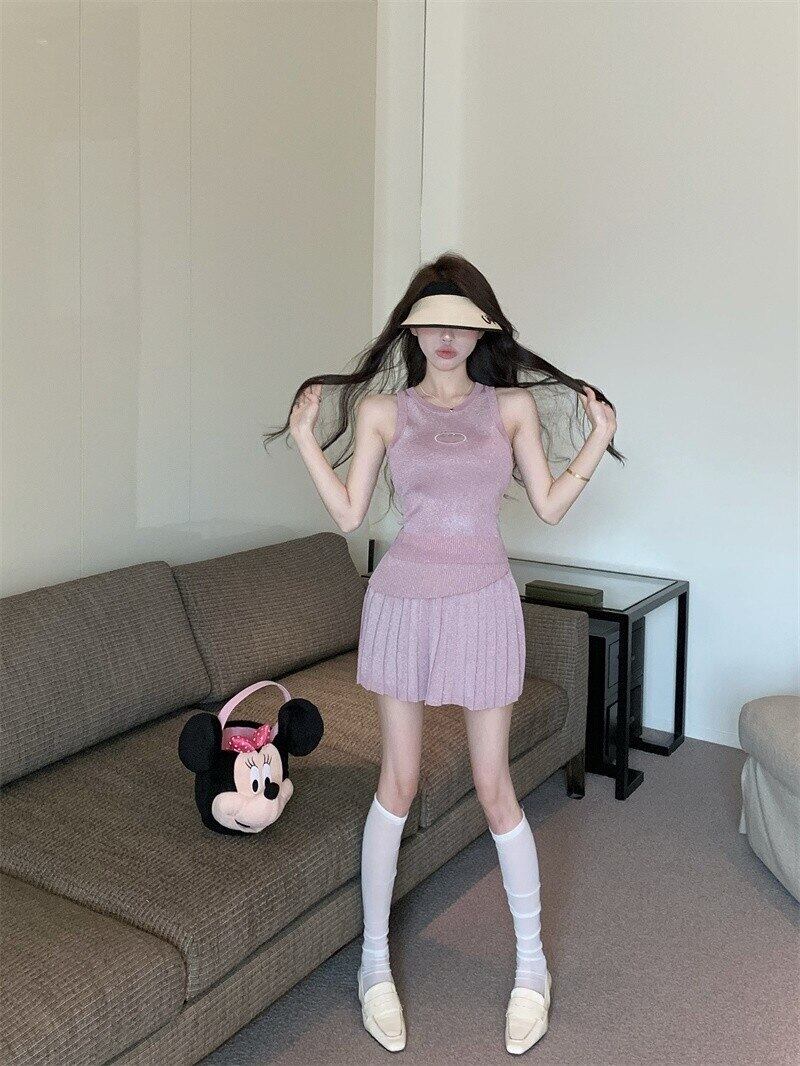 ニット 2 点セット ノースリーブ トップ + ウエストゴムプリーツスカート Hotsweet 夏服 エラスティック 伸縮 大人ガーリー スウィート キュート カジュアル サマー 夏物