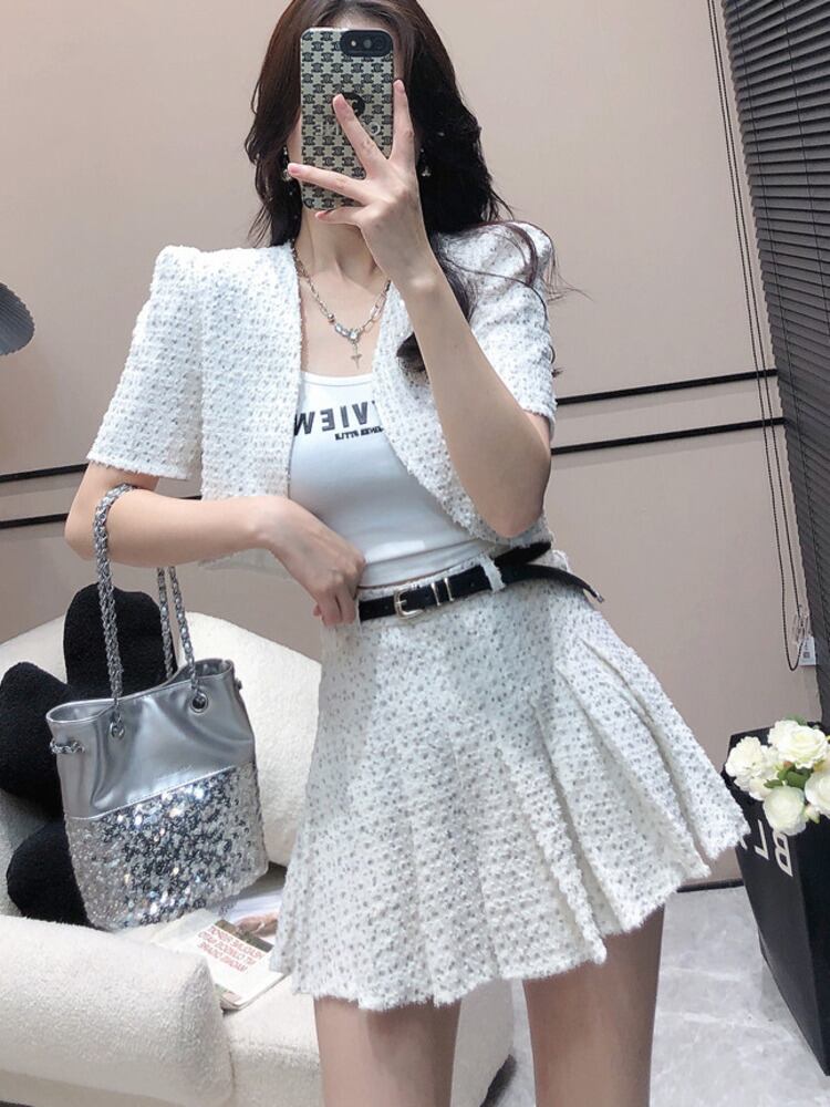 ストリートスパンコール Y2K ツーピースセットジャケットコートクロップトップ + プリーツスカートスーツ夏 2 ピース衣装 サマー 夏物