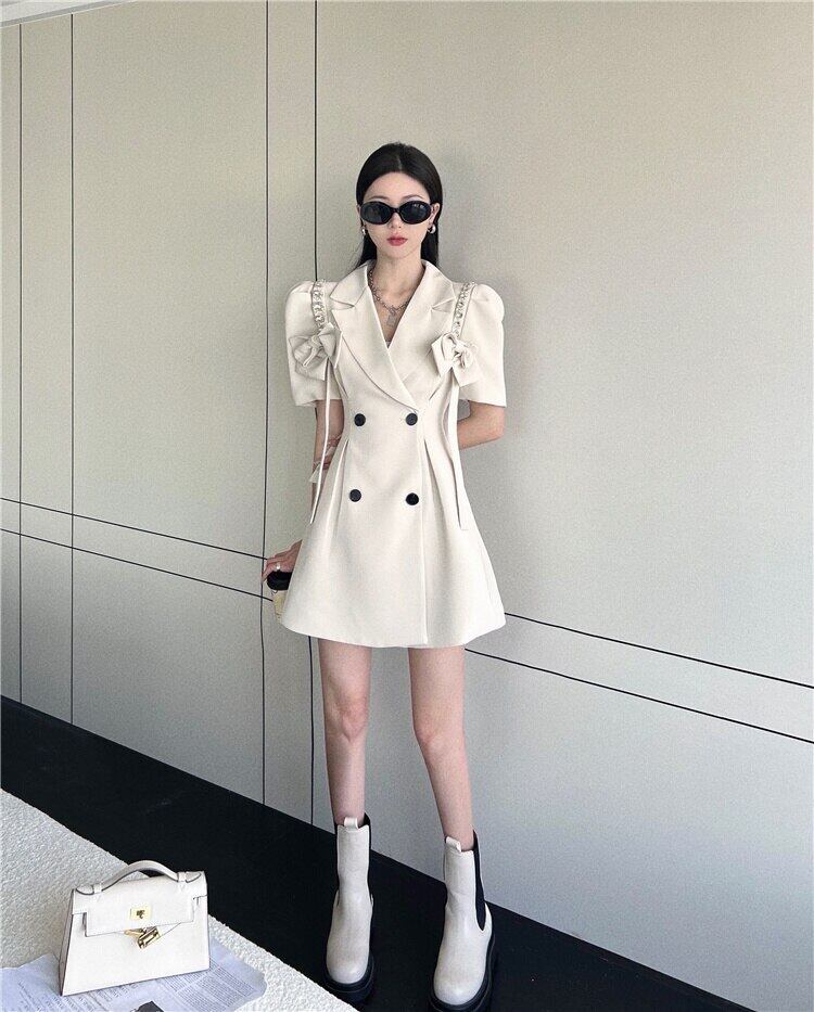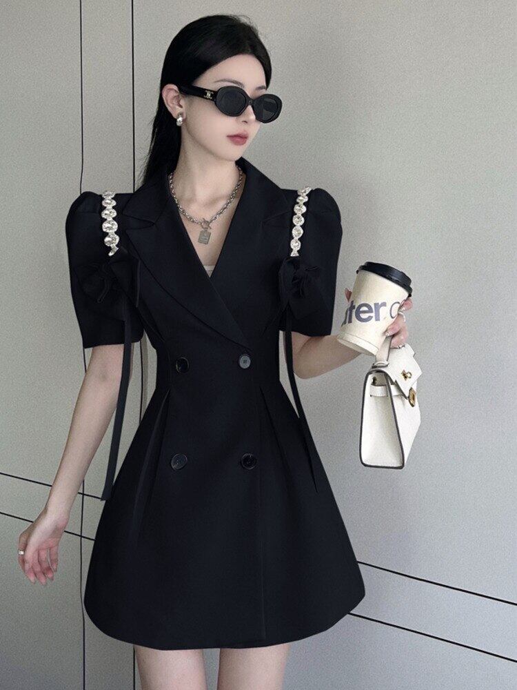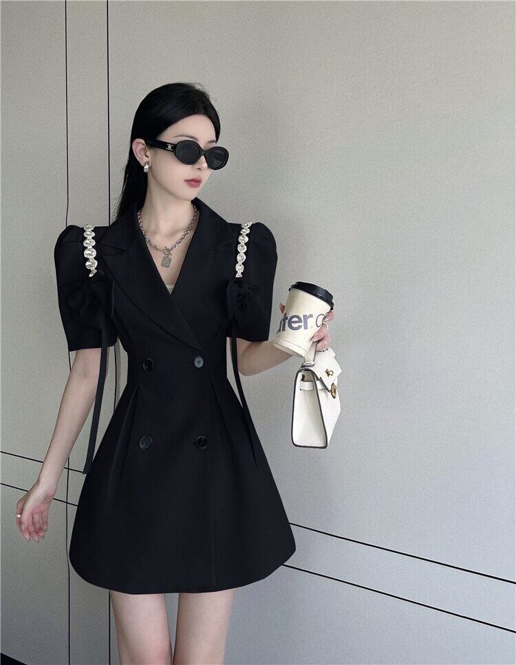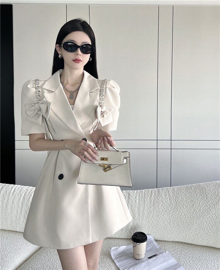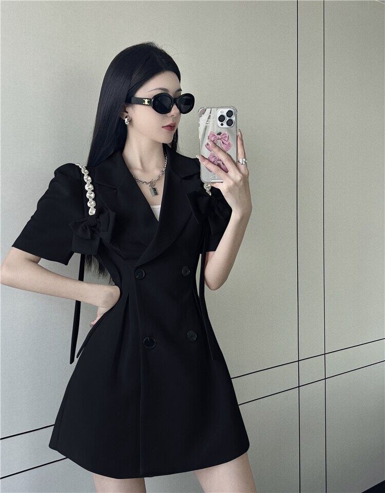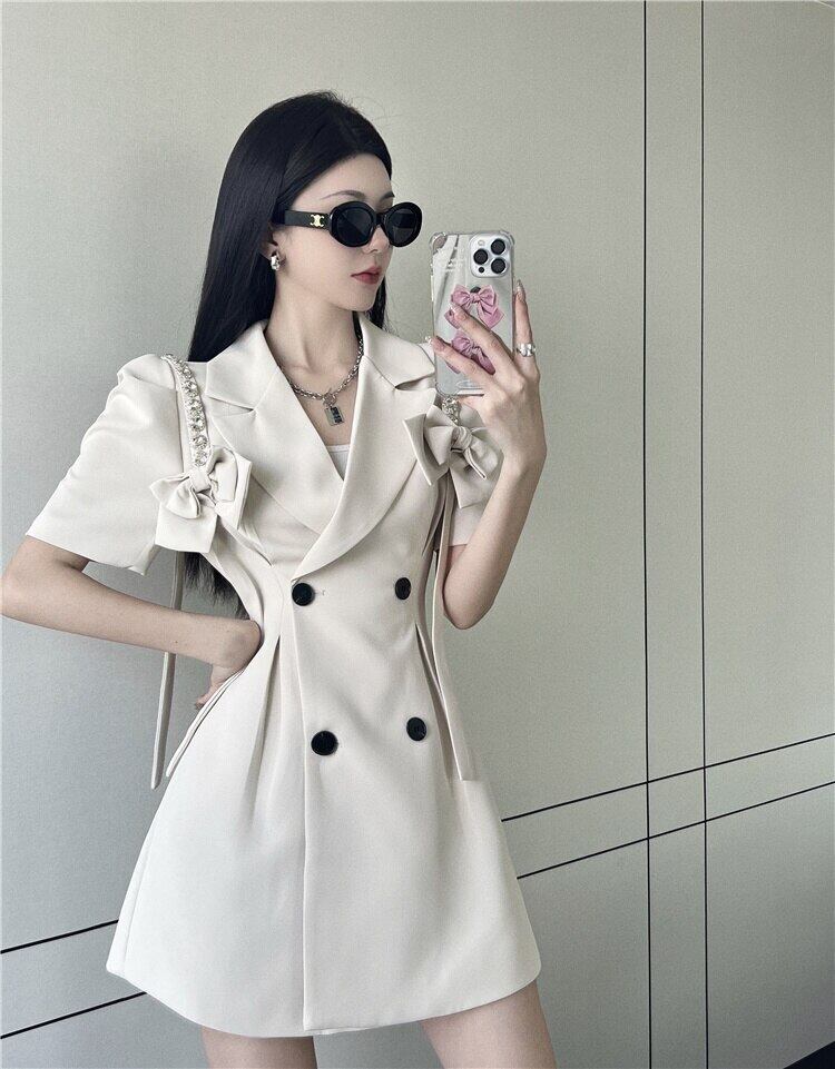 イングランドブレザードレス OL ダブルブレスト半袖サマードレスダイヤモンド弓パーティードレス ショート リボン ハーフスリーブ 夏物 ヨーロピアン