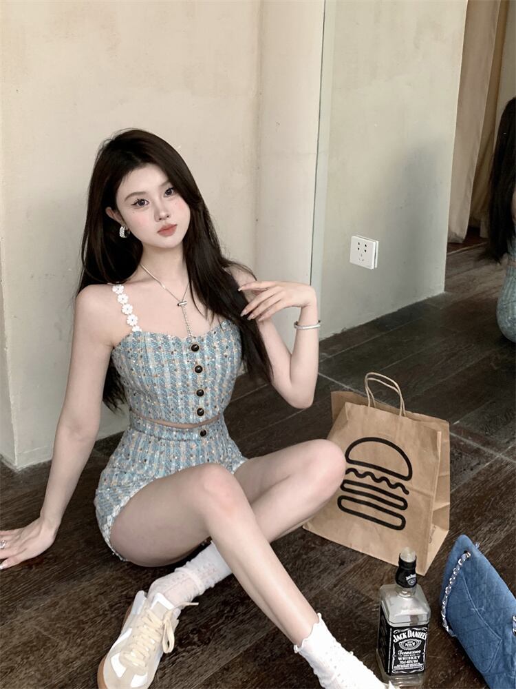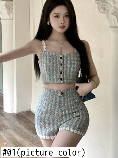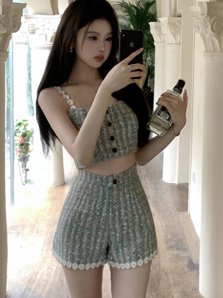 HotSweet レースパッチワークツイード 2 点セットチェック柄キャミソール + ウエストショートセット夏小さ香り 2 ピースパンツセット 大人ガーリー スウィート キュート カジュアル サマー 夏物