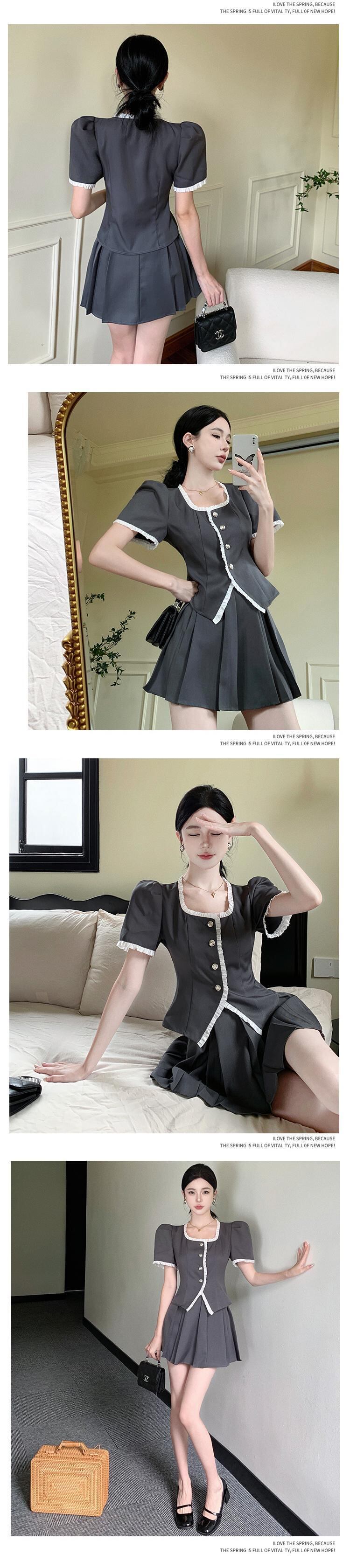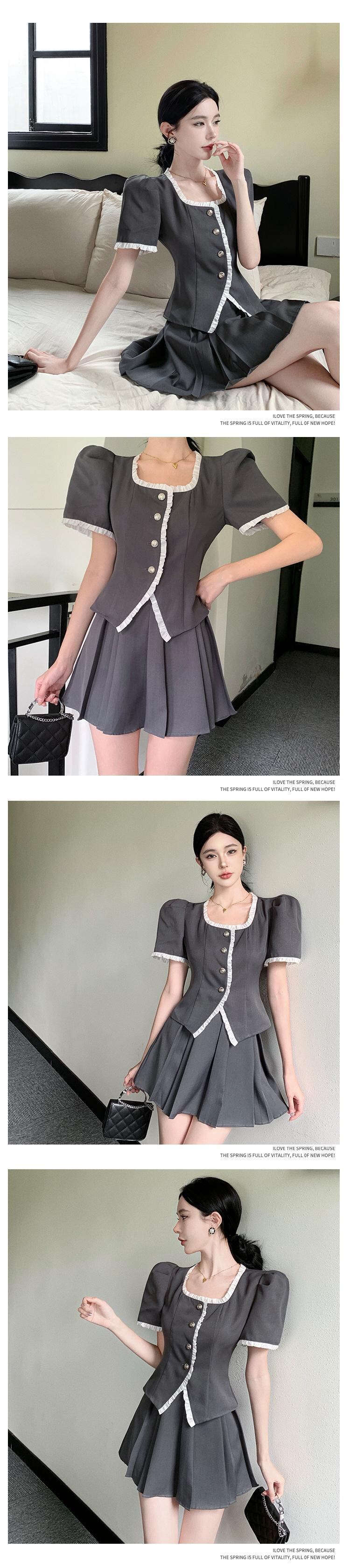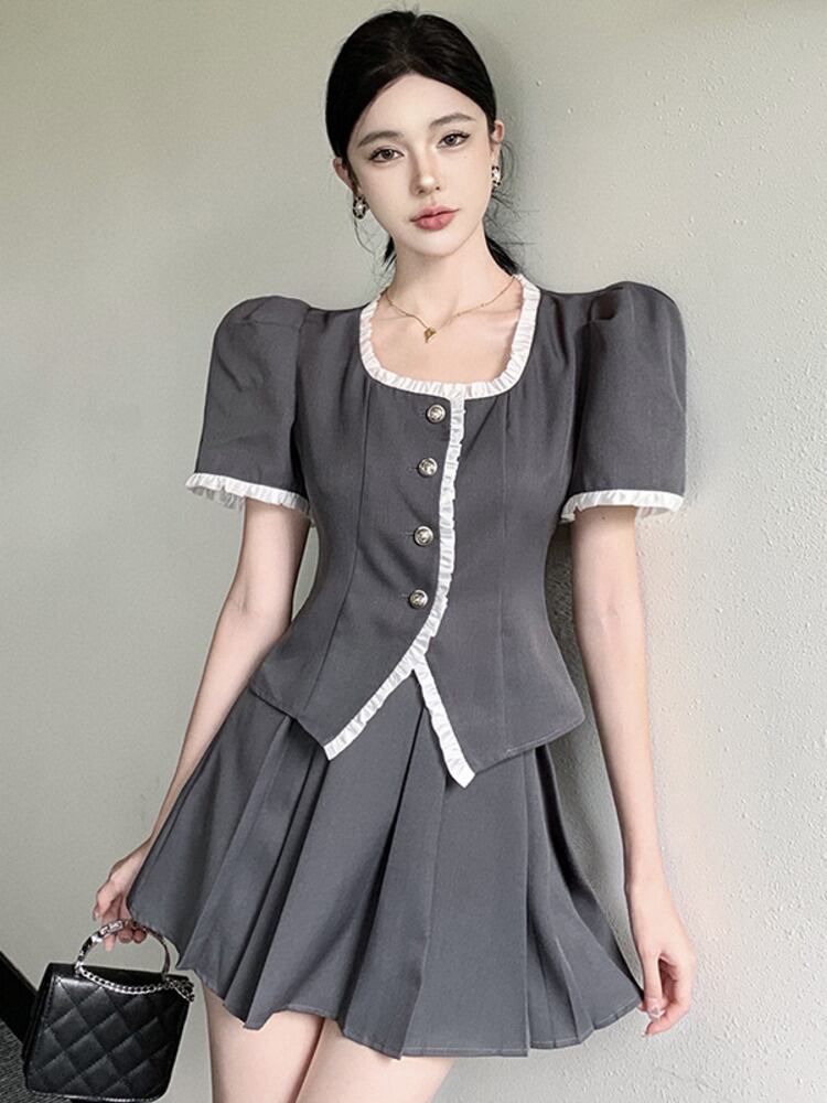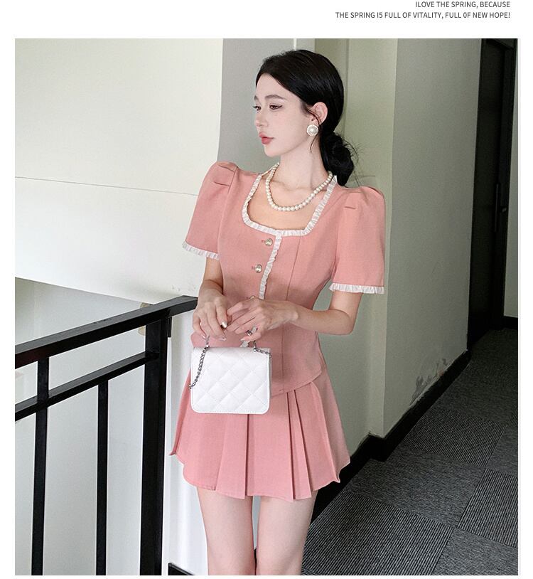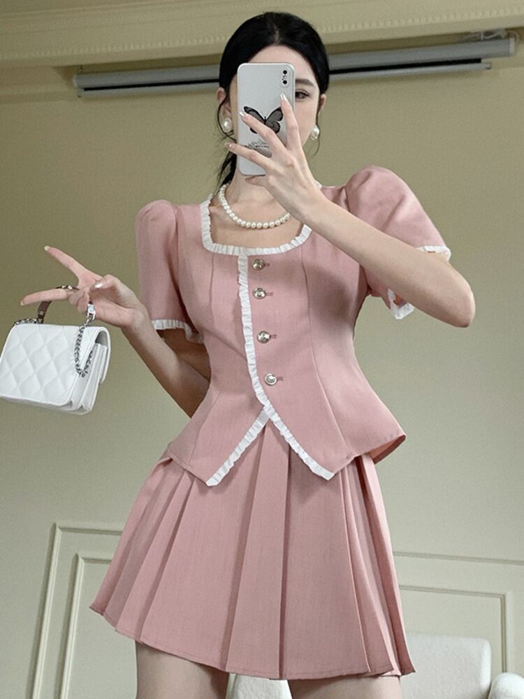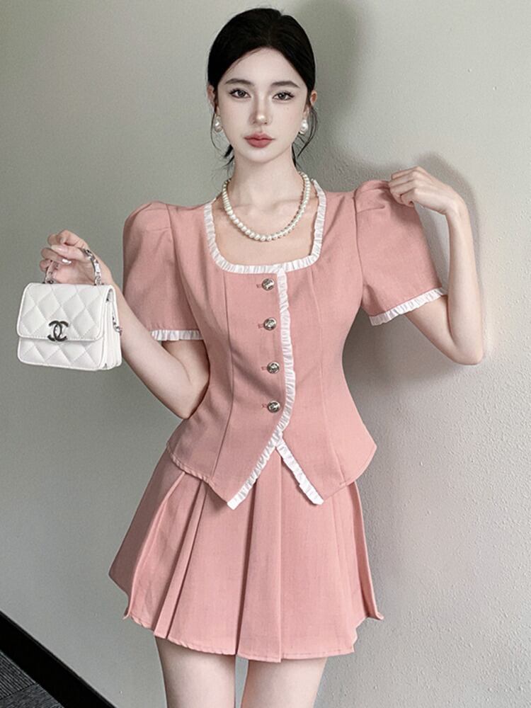 夏服スモールフレグランスツーピースセットパフスリーブトップ+プリーツスカート2ピーススーツ サマー 夏物
