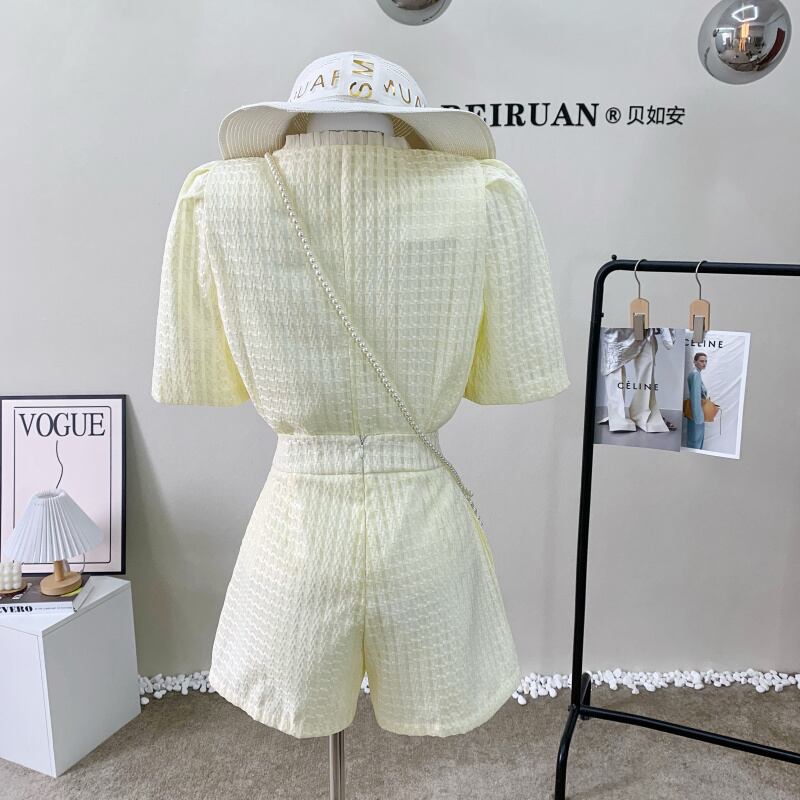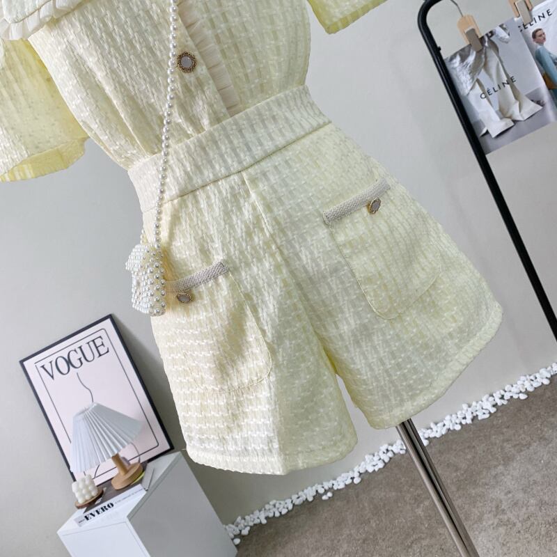 フレンチスタイル小さ香り2点セットパフスリーブシャツブラウストップ+ウエストショートセットパンツセット
