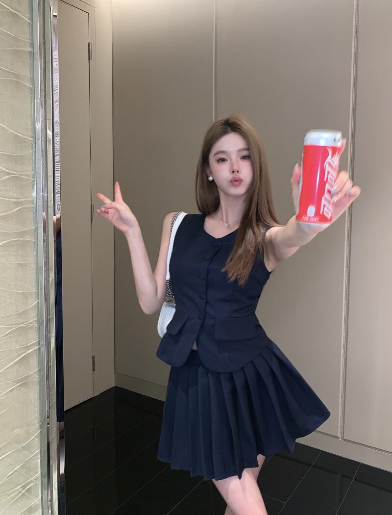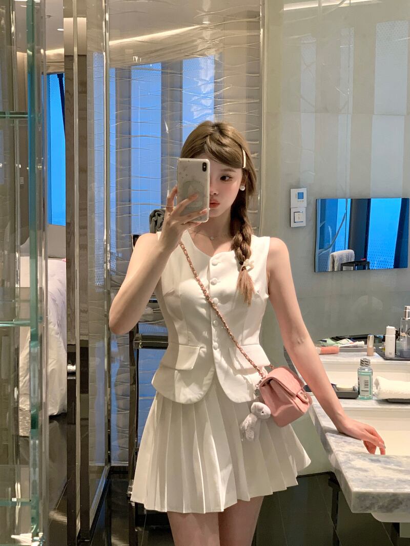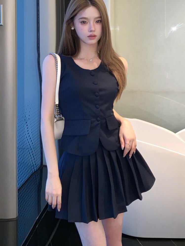 スモールフレグランスツーピースセットブレザーベストトップ+プリーツスカートスーツOL 2点セット