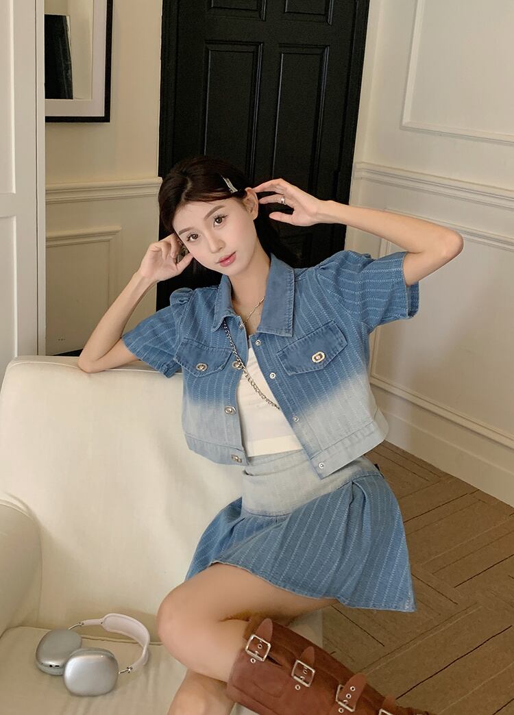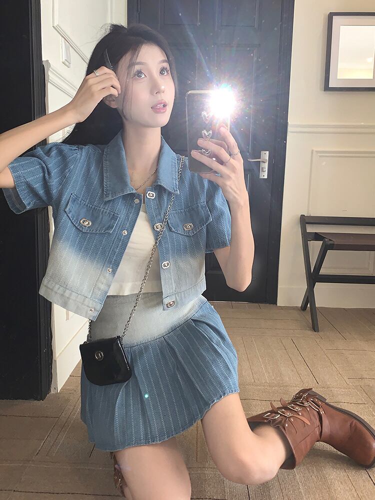 ストリートグラデーションデニム小さ香り2点セットジャケットコート+プリーツスカートスーツカウボーイツーピース衣装