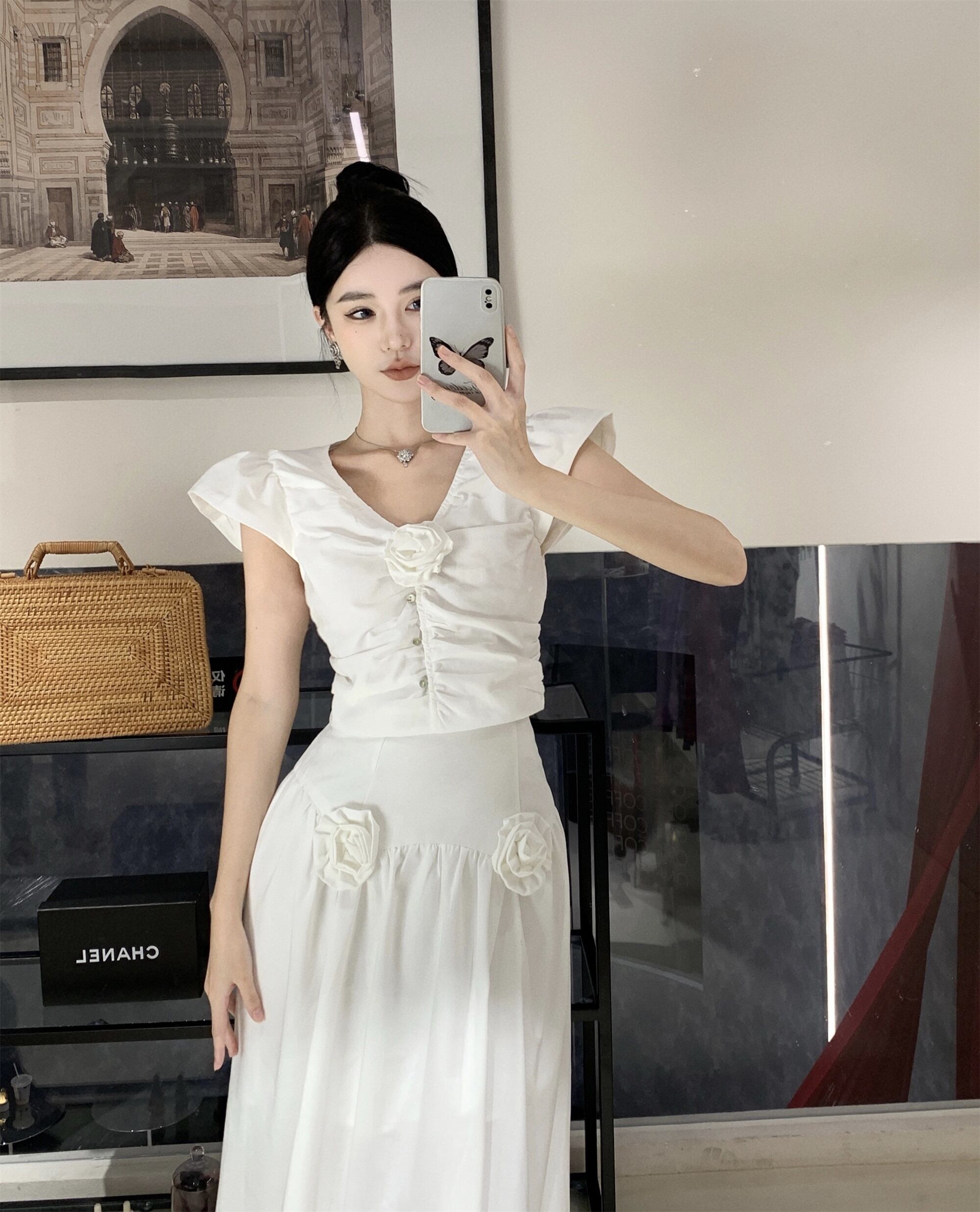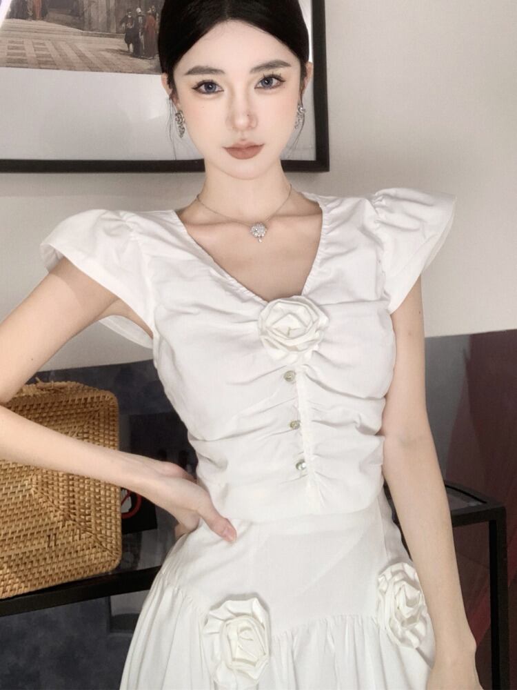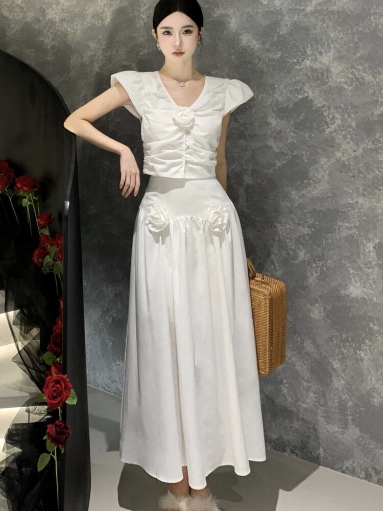 ツーピースセット 3D 花クロップトップ + ウエストロングスカートセットトレンド夏 2 ピーススーツ サマー 夏物 フラワーデザイン