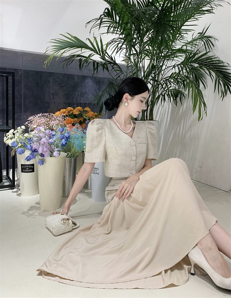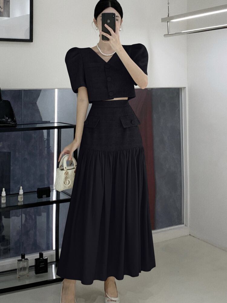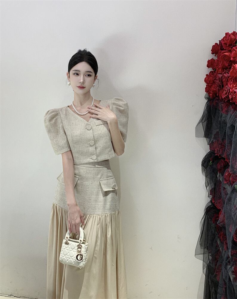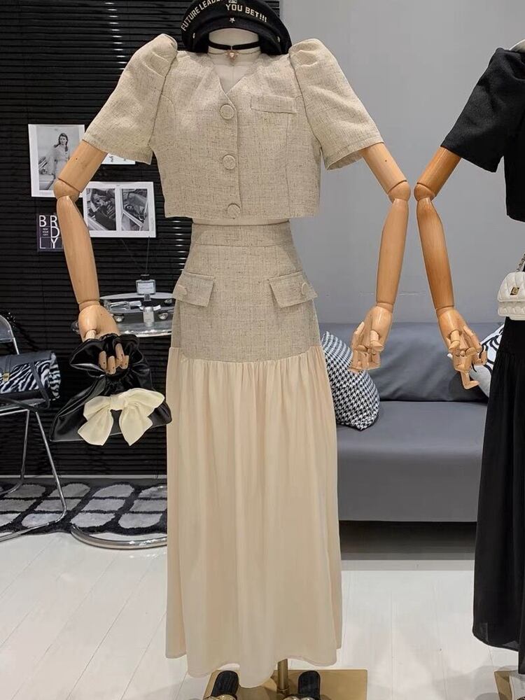 フレンチツーピースセットクロップトップ+パッチワークロングスカートスーツ夏2ピース衣装アンサンブル サマー 夏物