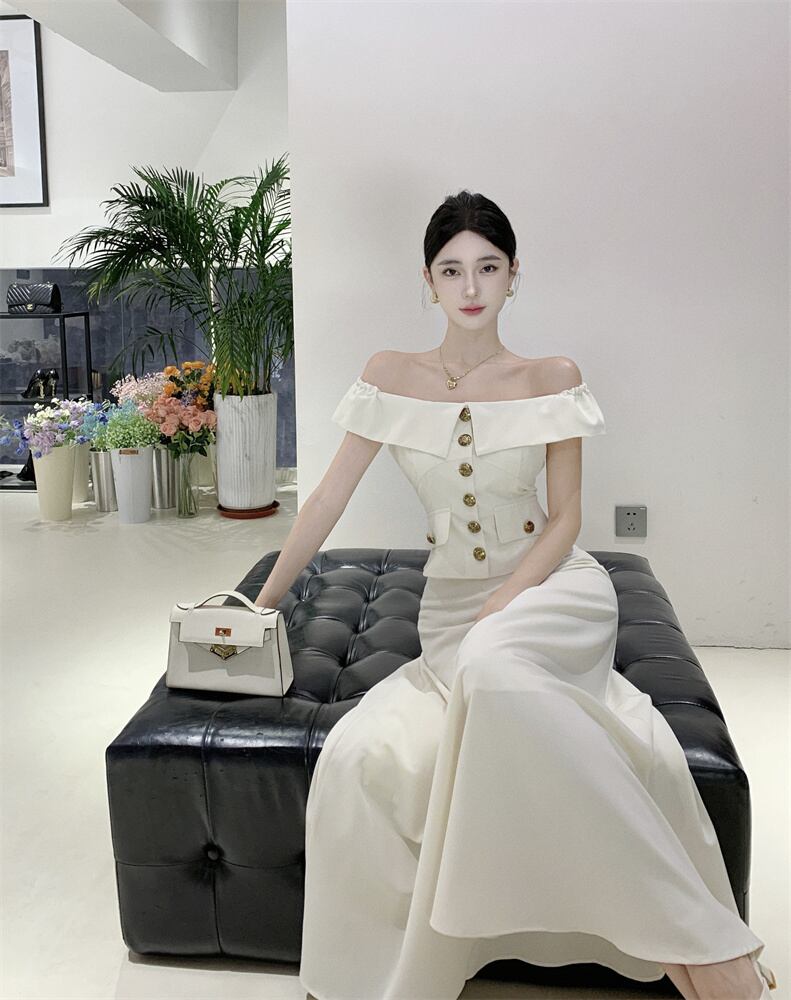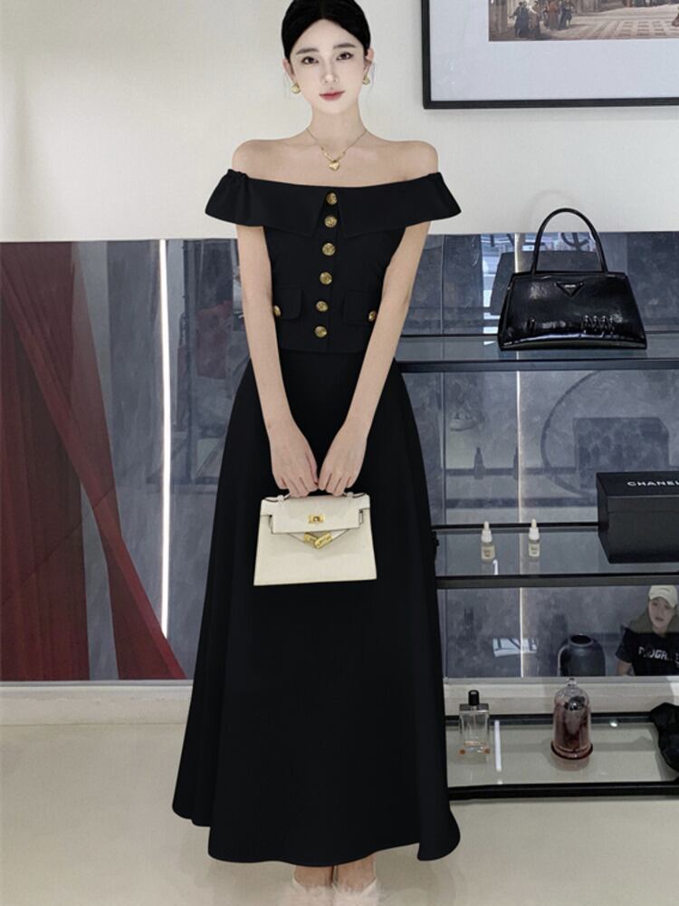 エンドフレンチ高級ツーピースセットスラッシュネッククロップトップ+ロングスカートスーツOL 2ピース衣装