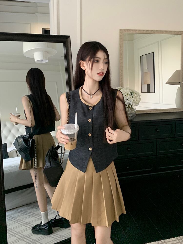 フランス小さ香りツーピースセットベストトップ + プリーツスカートスーツ夏 2 点セット Conjuntos Cortos サマー 夏物