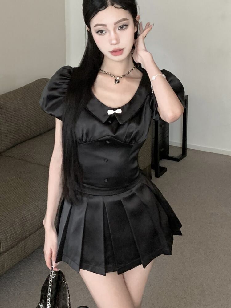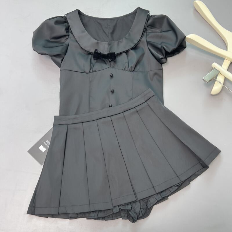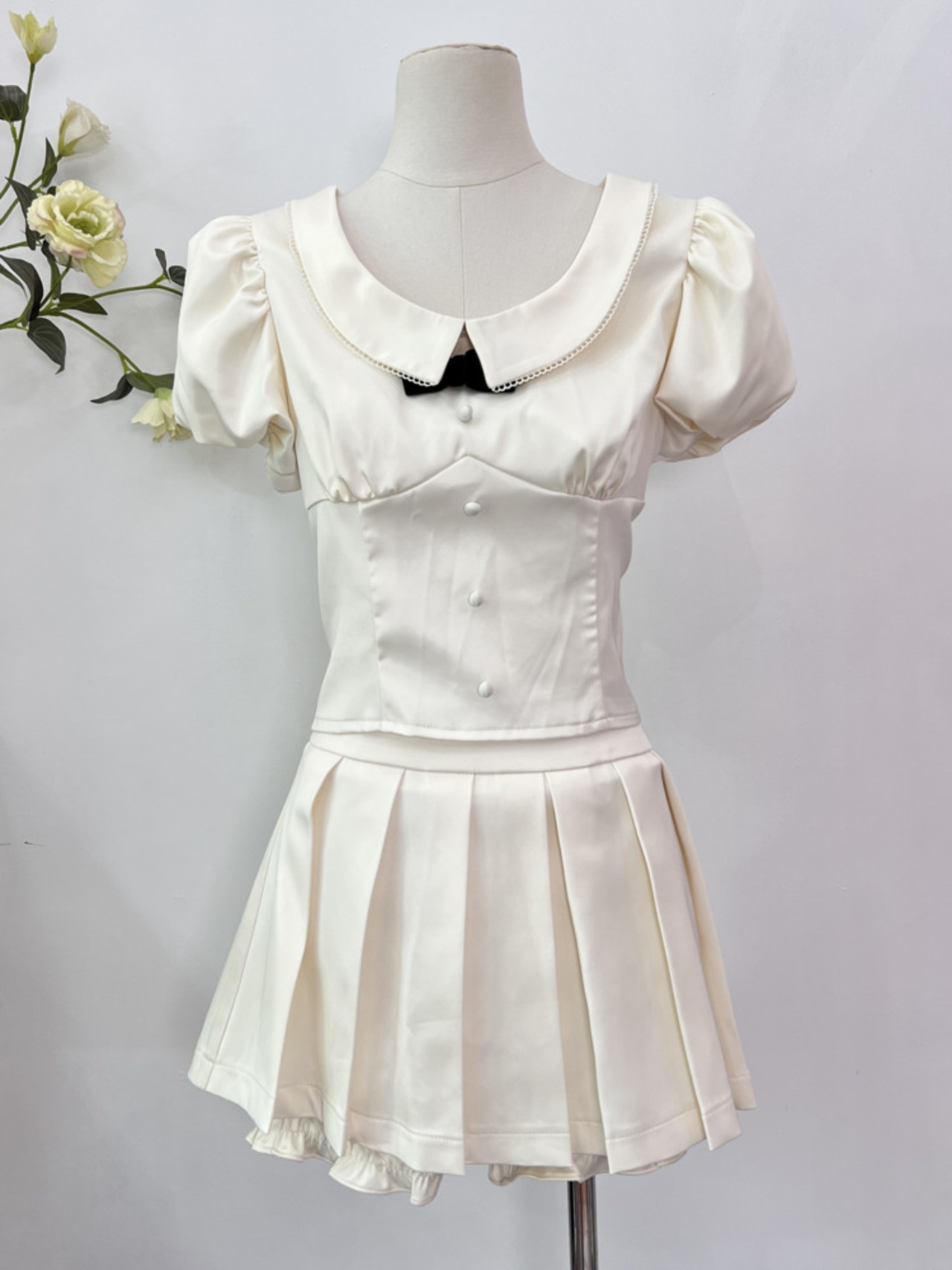 甘い 2 点セット衣装ガールズドールネックシャツクロップトップ + ウエストプリーツスカートスーツ夏 2 点セット 大人ガーリー スウィート キュート カジュアル サマー 夏物