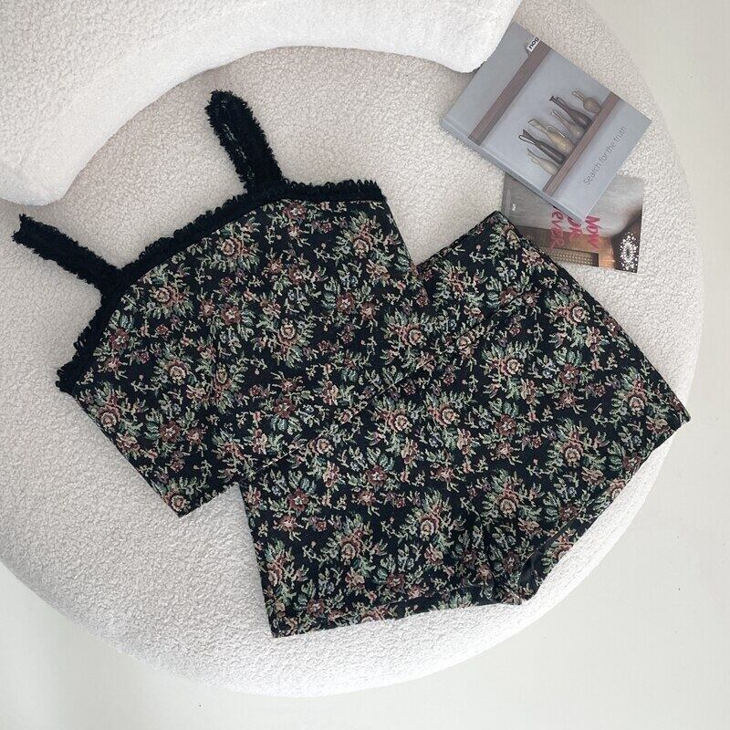 フレンチジャカードツーピースセットセクシーキャミソールトップ+ウエストショートセット夏小さ香り2ピースパンツセット サマー 夏物